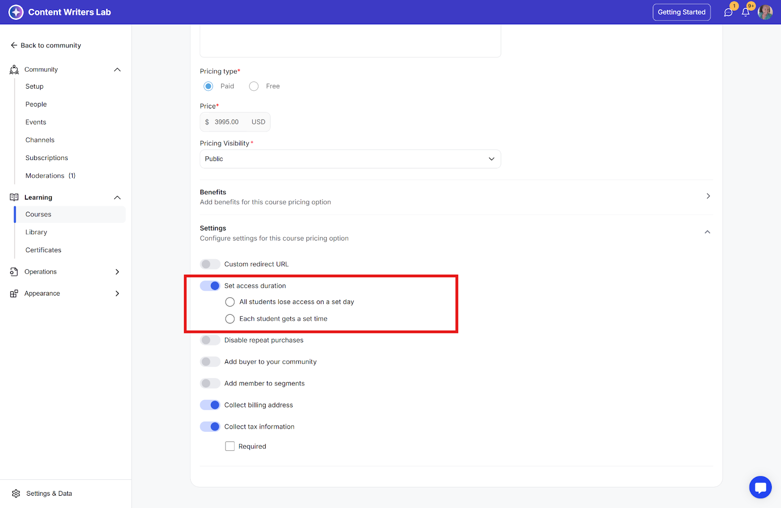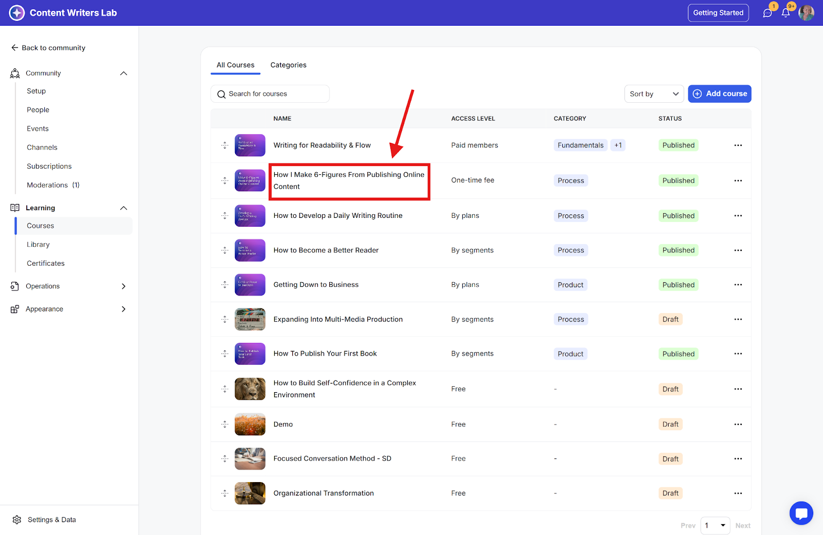 Step 3: Select the course that is set to an access level of One-time Fee.