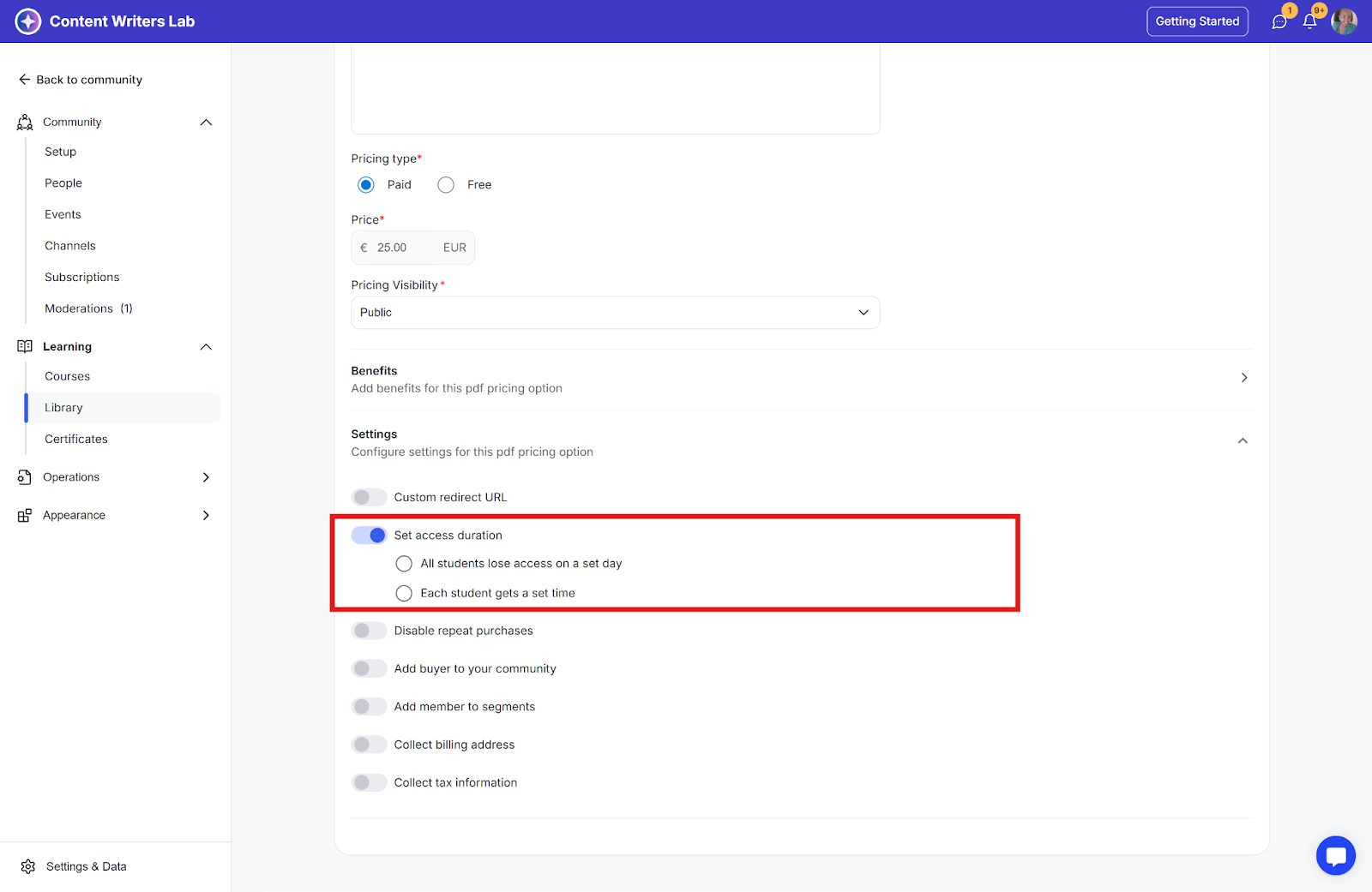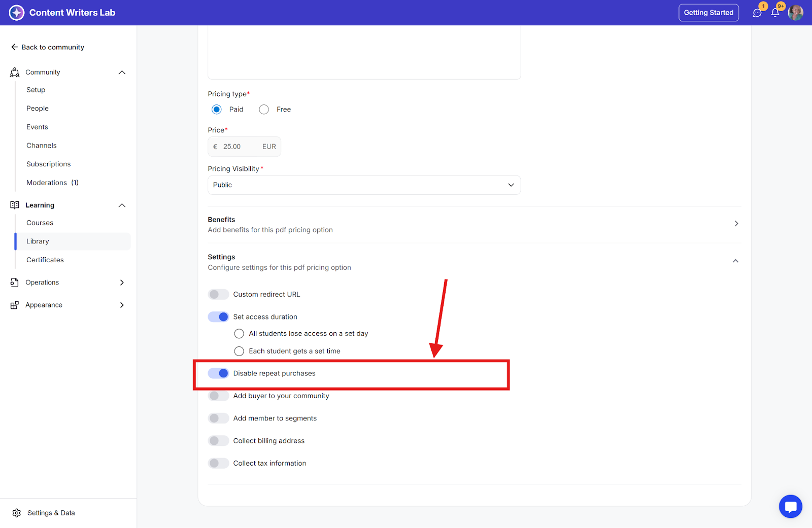 If a student purchases a course or library content through a pricing link with the “Disable repeat purchases” option enabled, they will not be able to use the same pricing again if they want to regain access after their access expires at the end of the defined period.