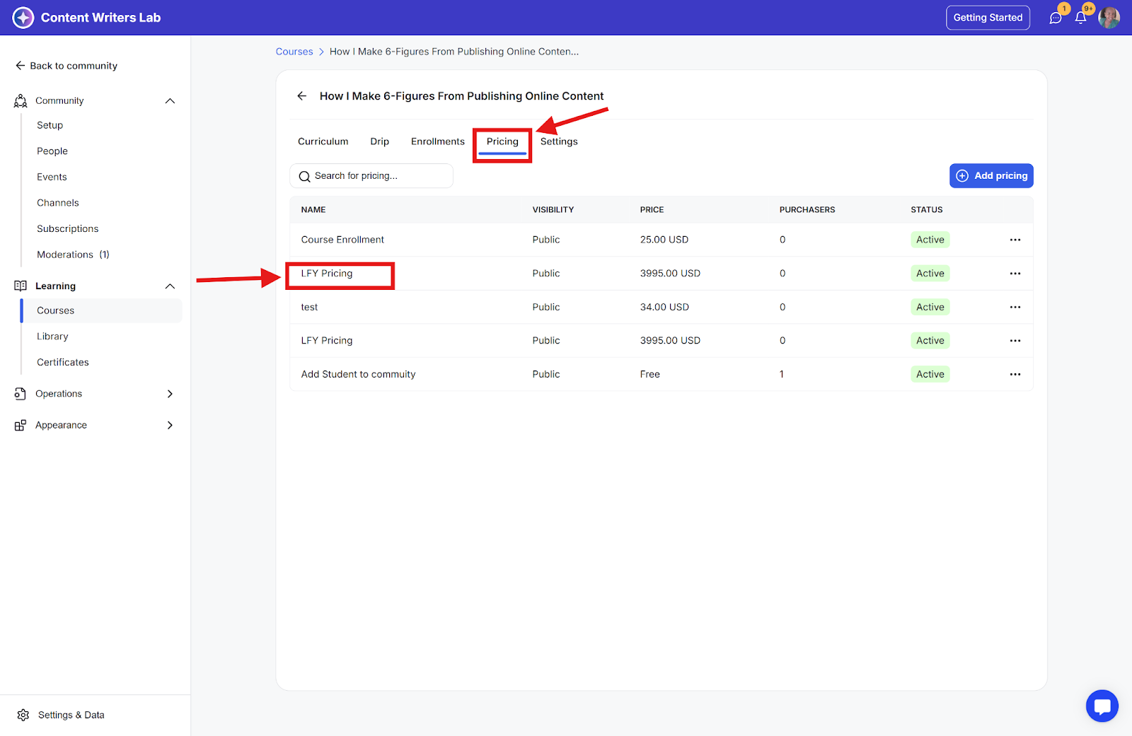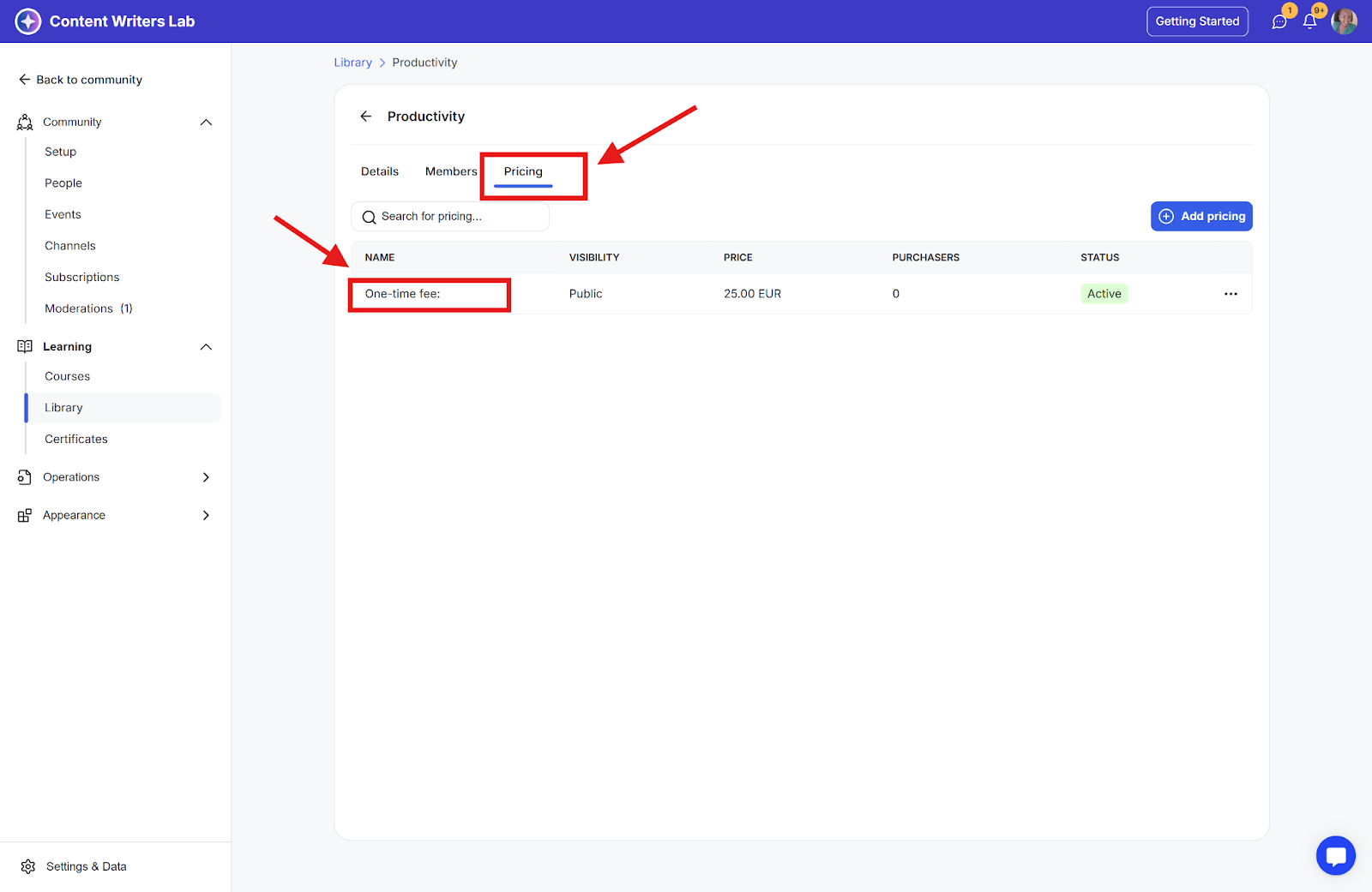 Step 4: Go to the Pricing tab and click on the pricing to edit or create a new price. Click on the pricing name to open the edit pop-up.