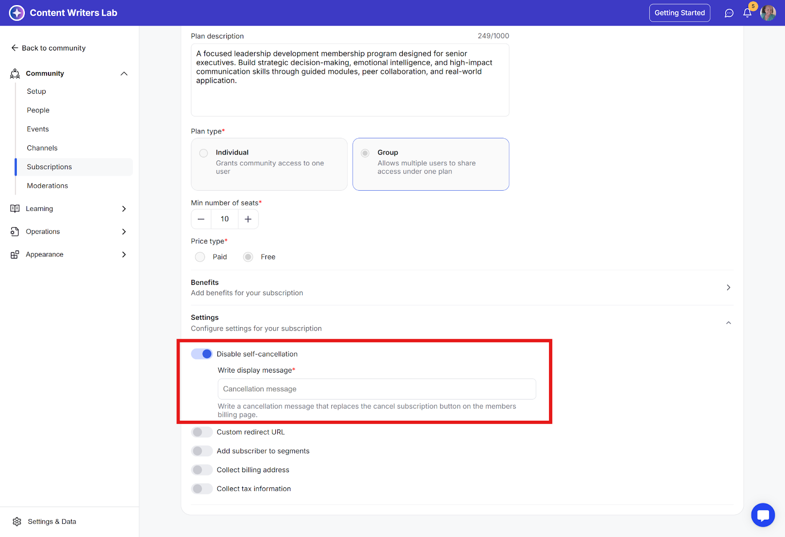 This guide explains how to prevent members from canceling their own subscriptions and how to set up a custom message with cancellation instructions.