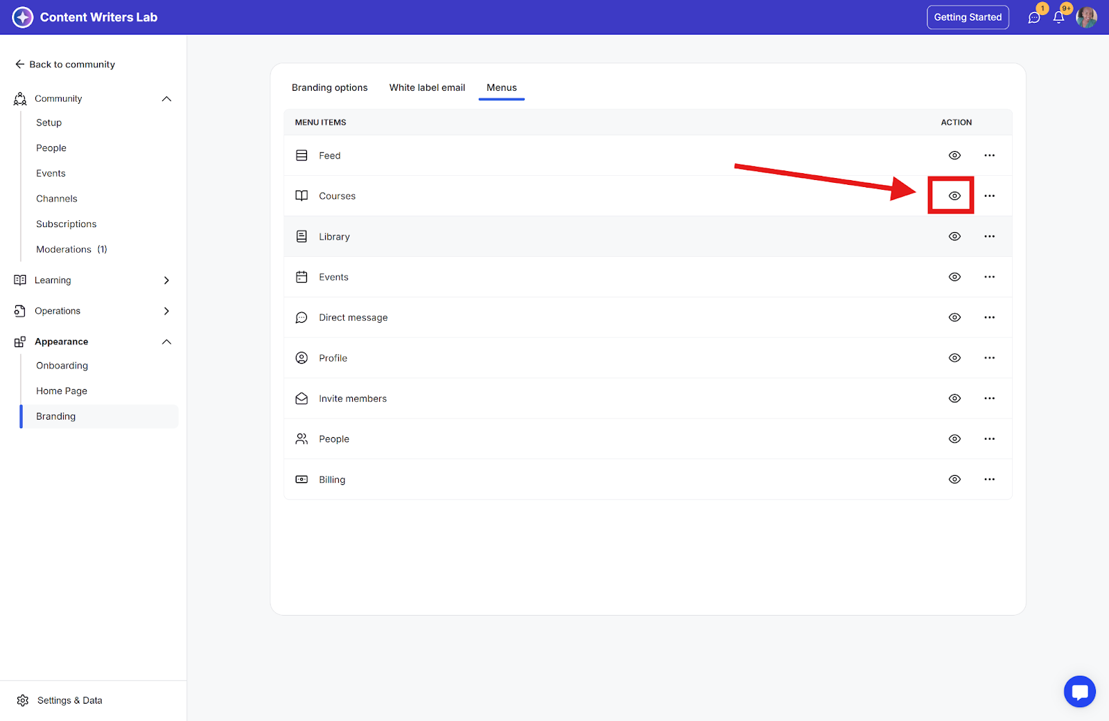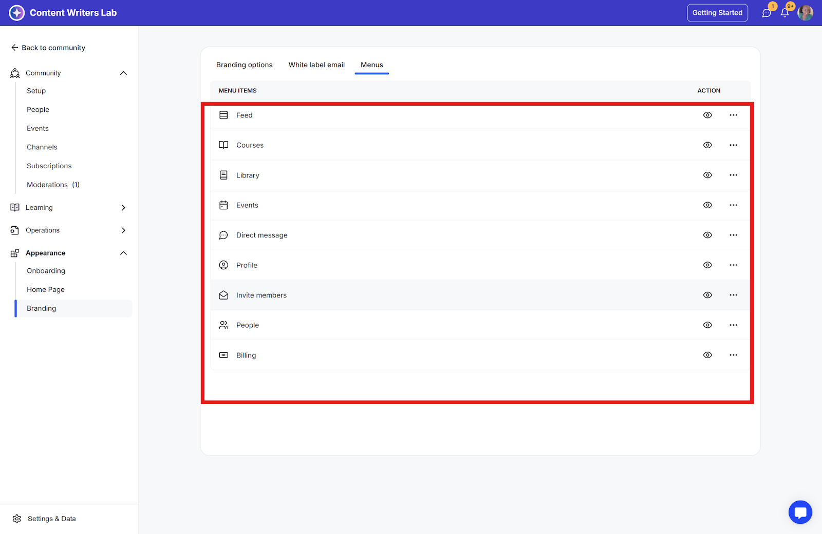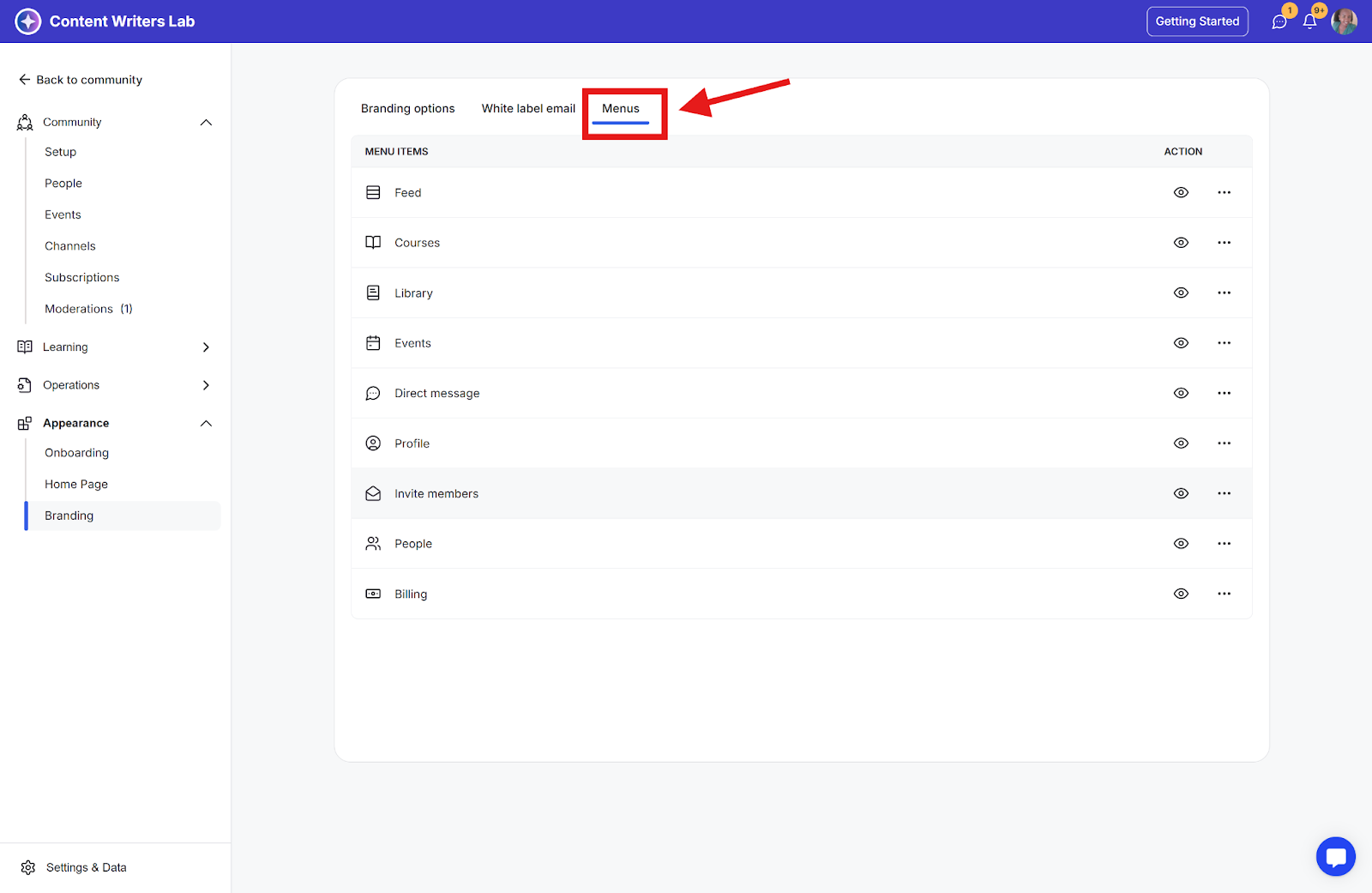 Step 4: The Menus page displays all menu items that can be hidden from community members, including: