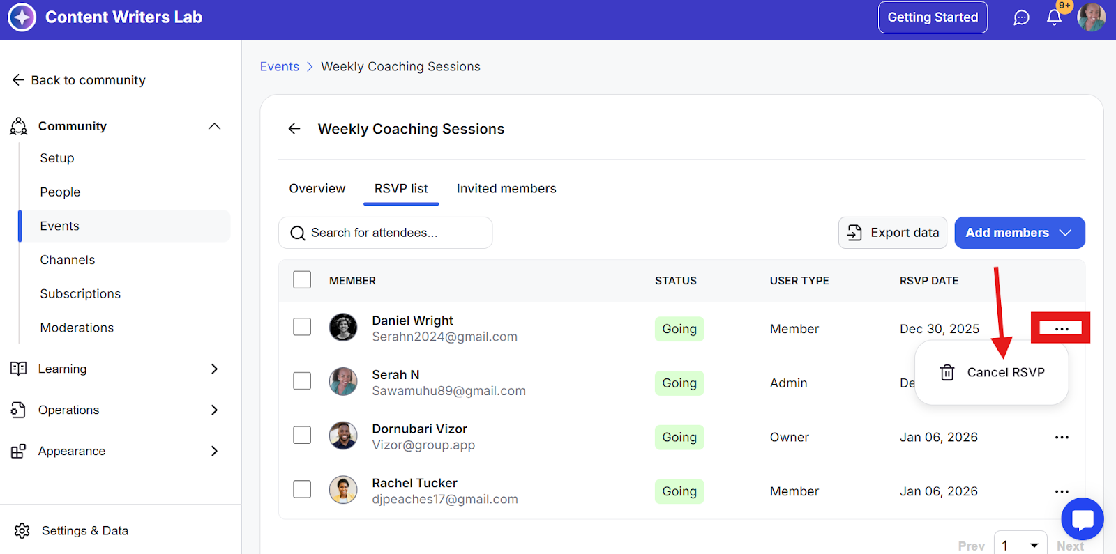 Step 2: Click on the three-dot icon for the member whose RSVP you would like to cancel and select Cancel RSVP.