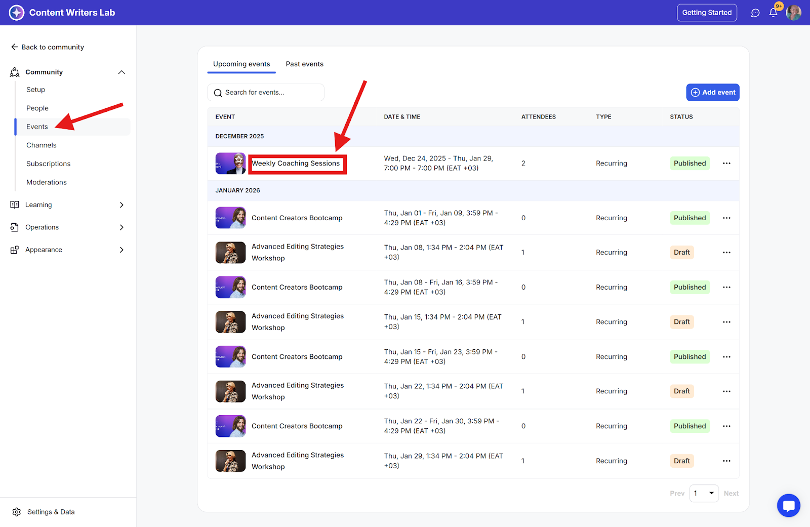 Step 2: Navigate to Events and locate the event you want to RSVP members to.