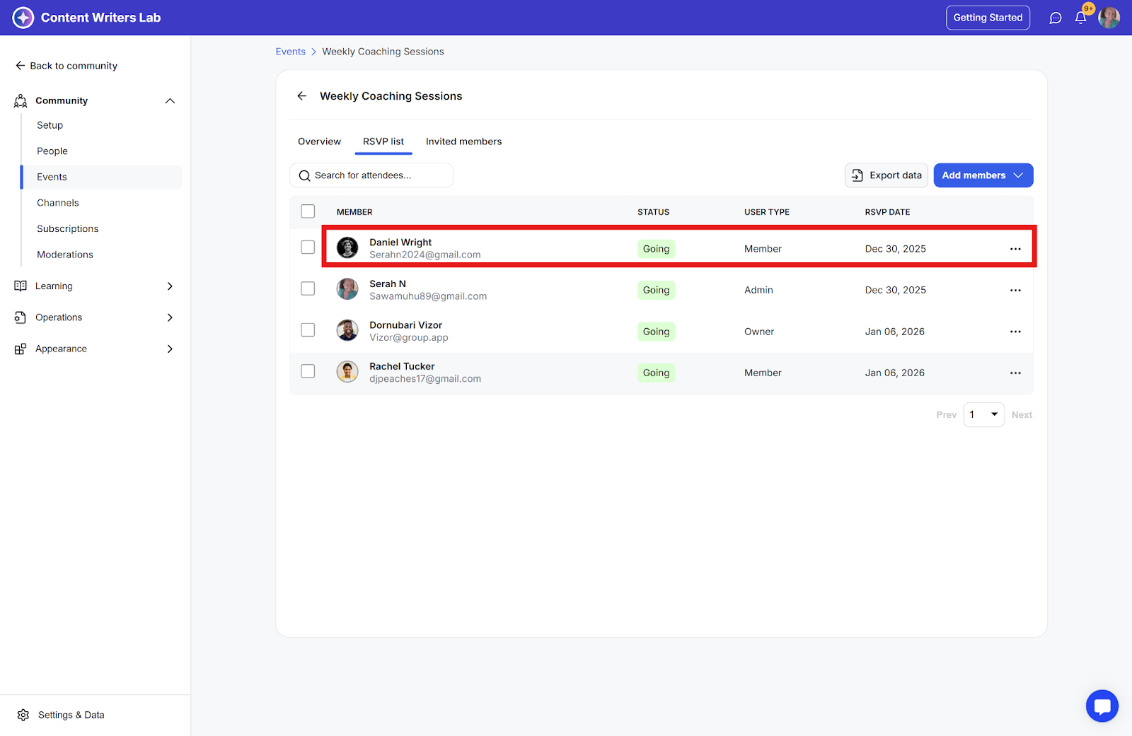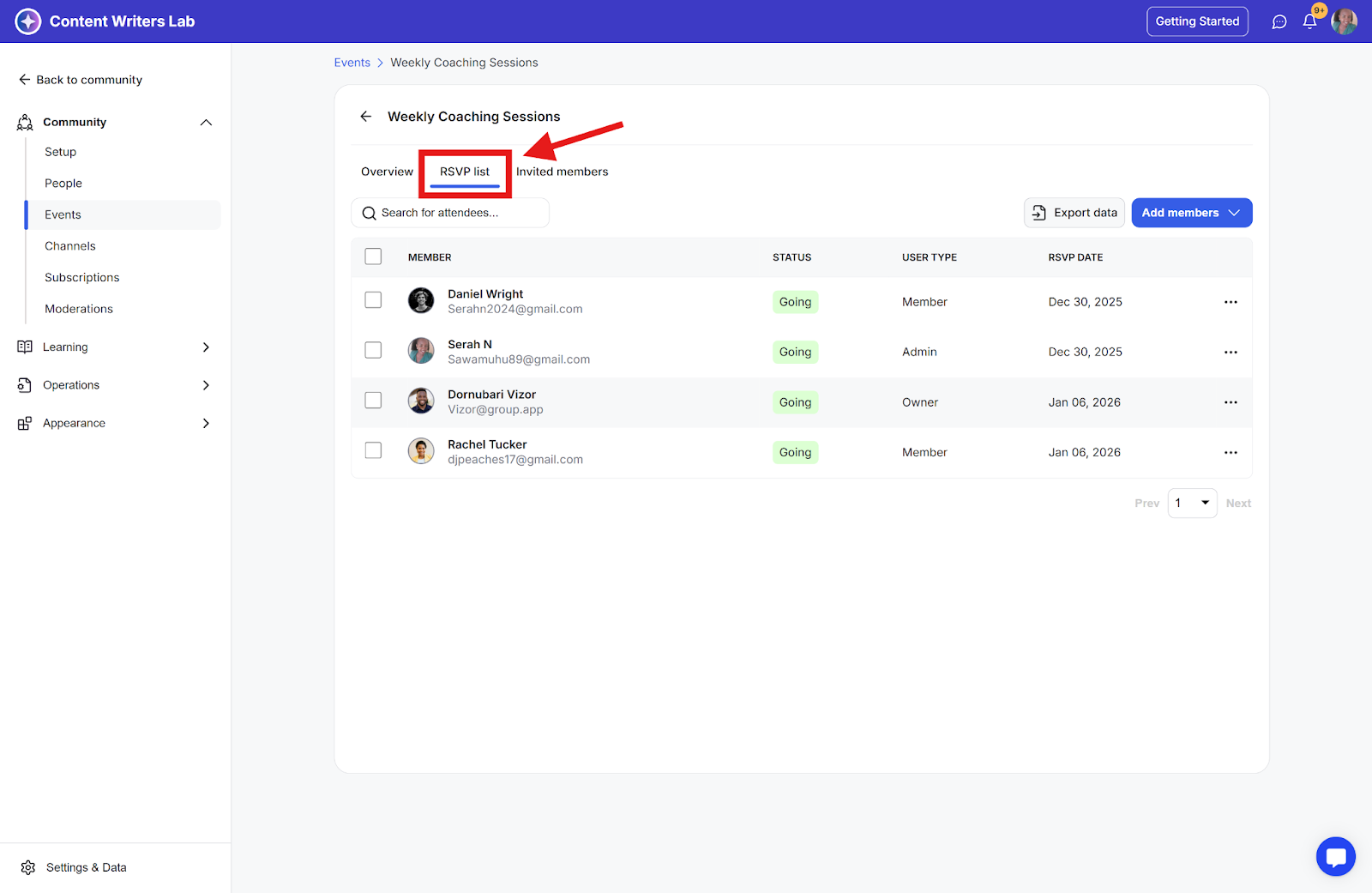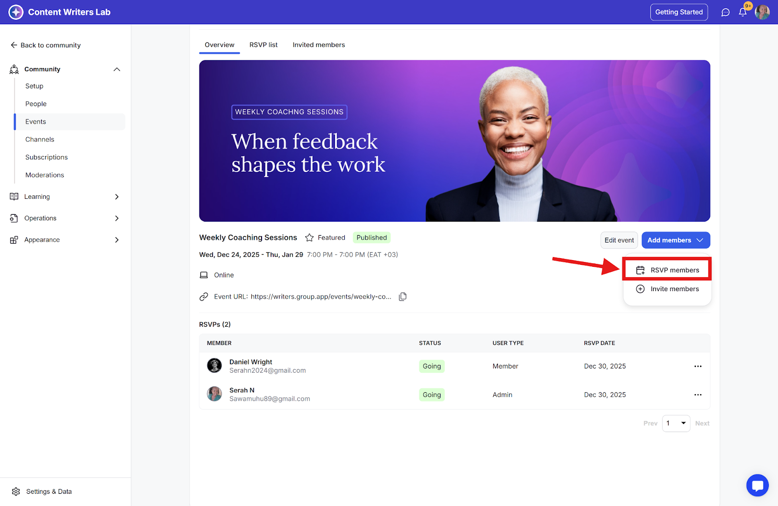 Step 3: The status of the member will change to going, and they will also be added to the RSVP list.