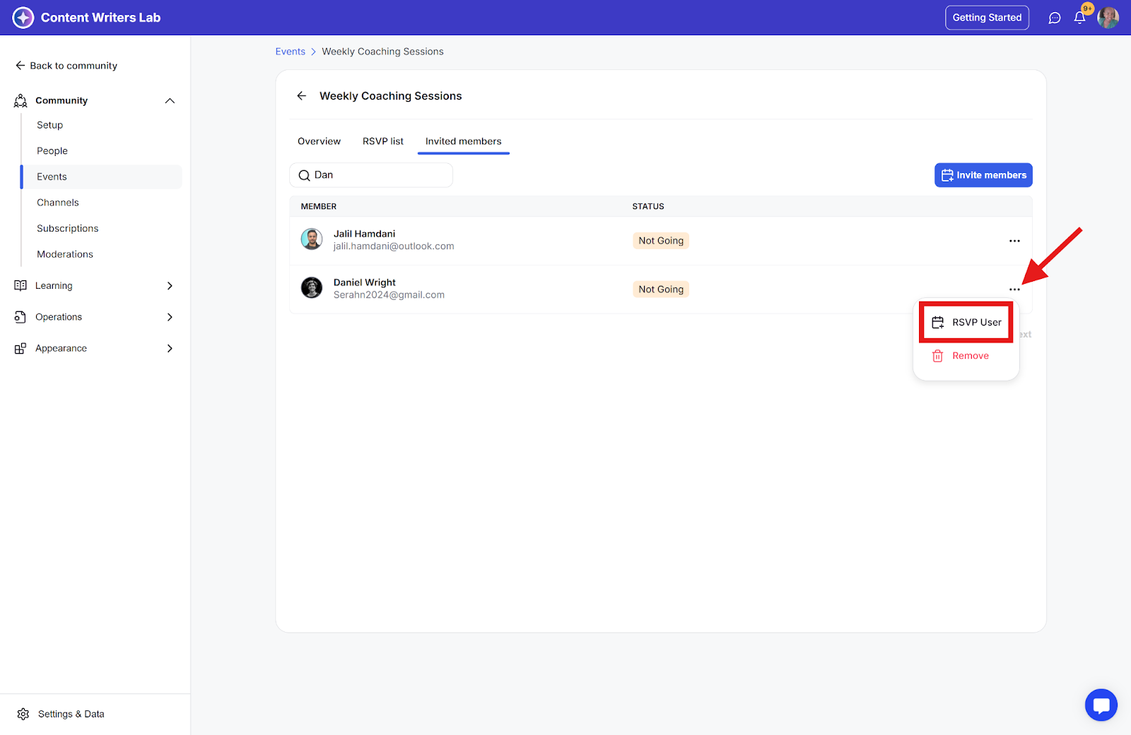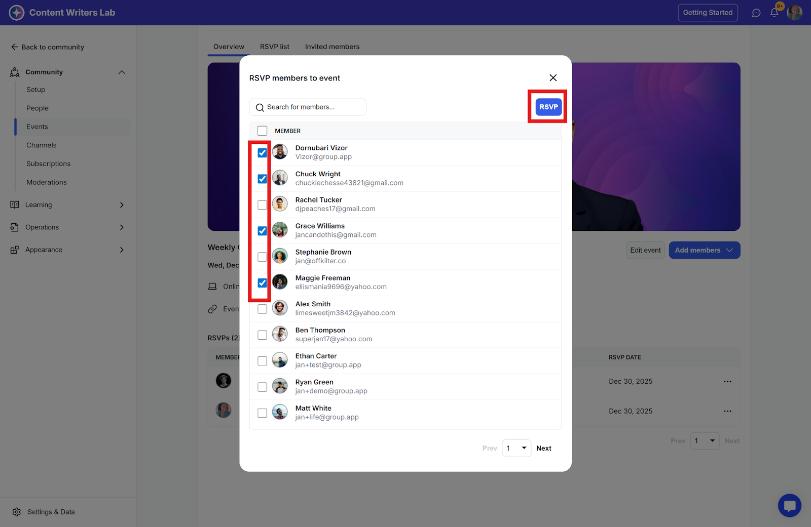 Step 5: A pop-up will open showing community members who haven’t RSVP’d yet, as well as those who have canceled their RSVP. Select the members you want to manually RSVP to the event, then click RSVP to confirm.