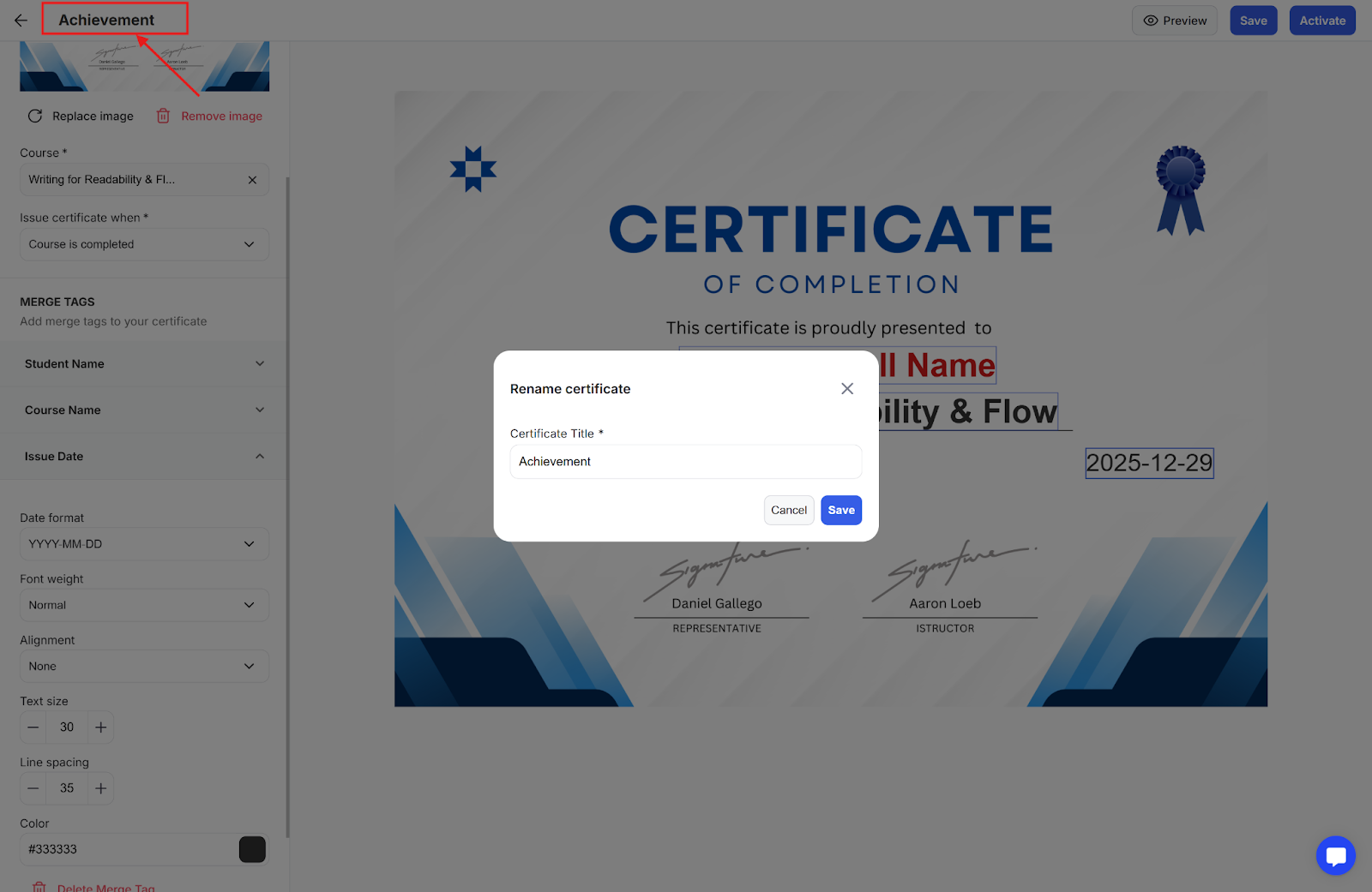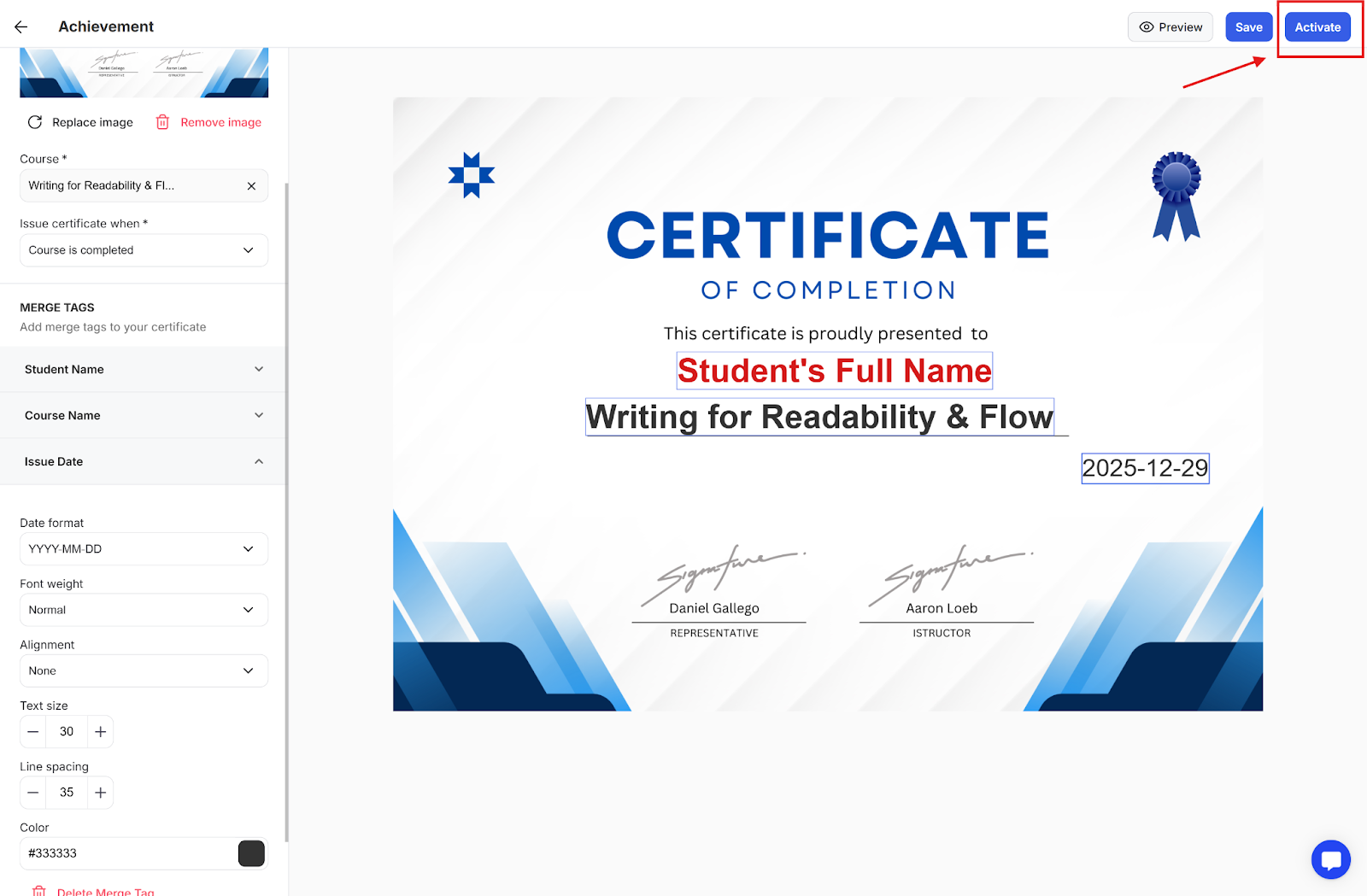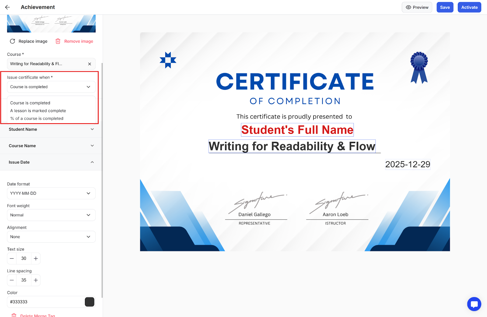 Step 4: Activate the certificate so that it is automatically issued once the student reaches the milestone you had set for when the certificate should be issued.