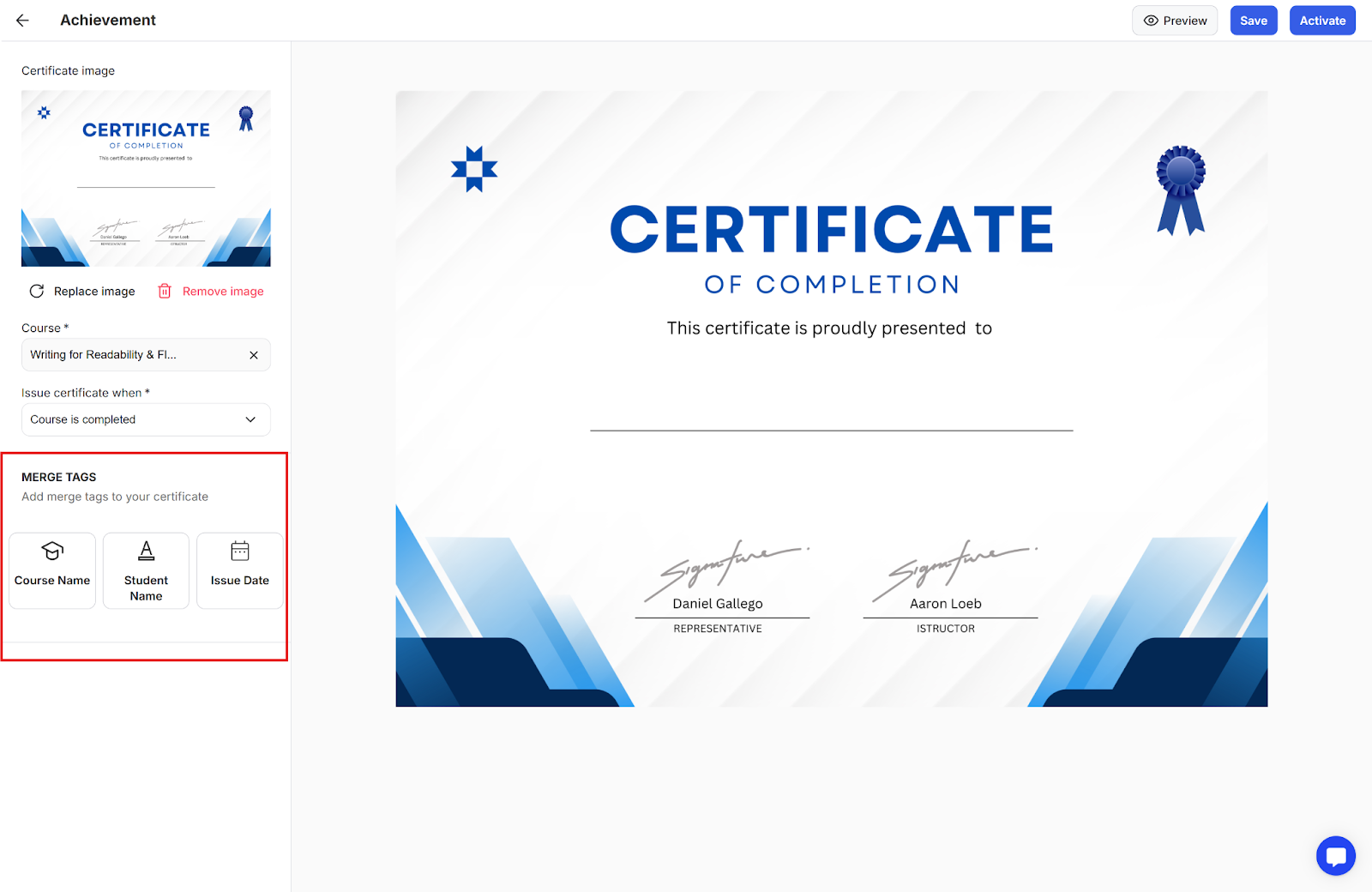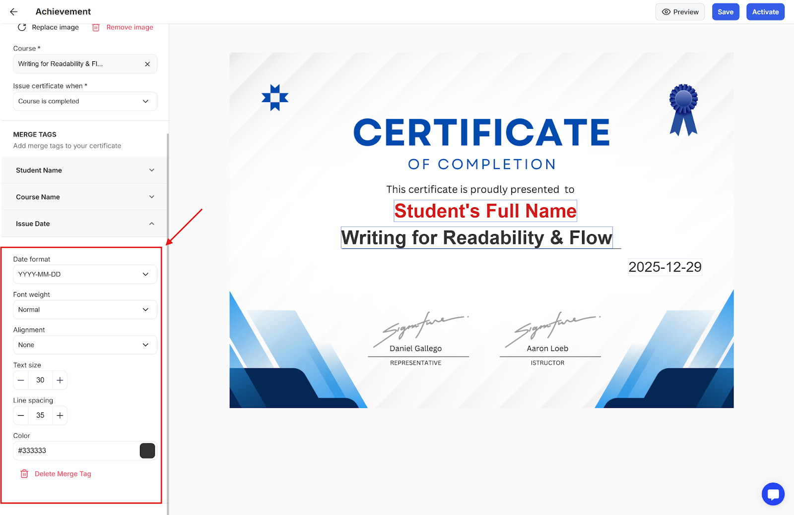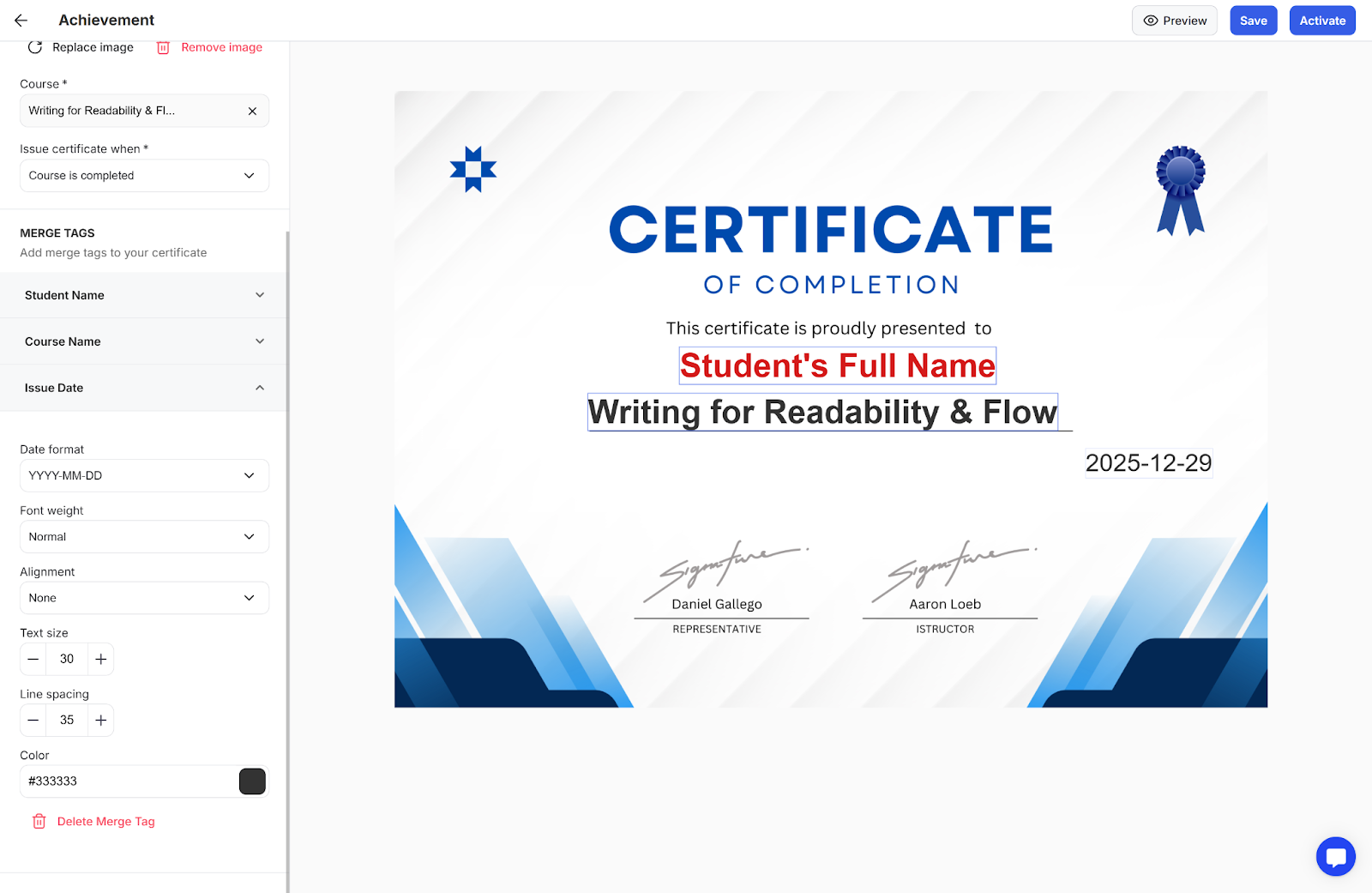 Step 4: Activate the certificate so that it is automatically issued once the student reaches the milestone you had set for when the certificate should be issued.