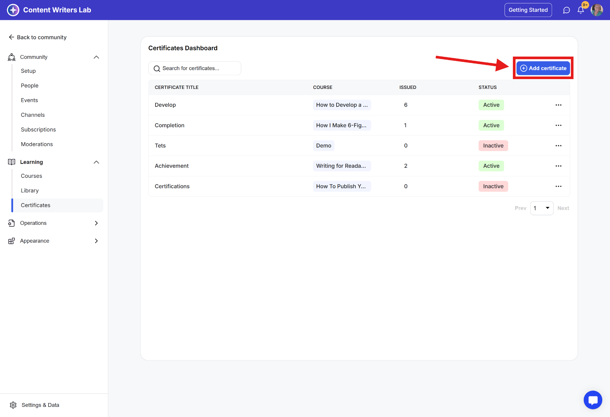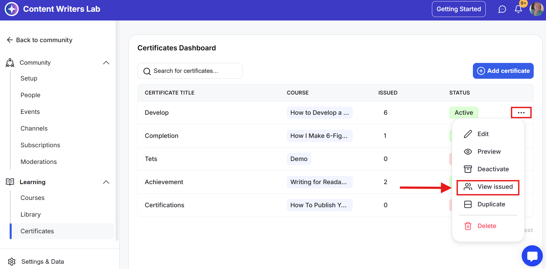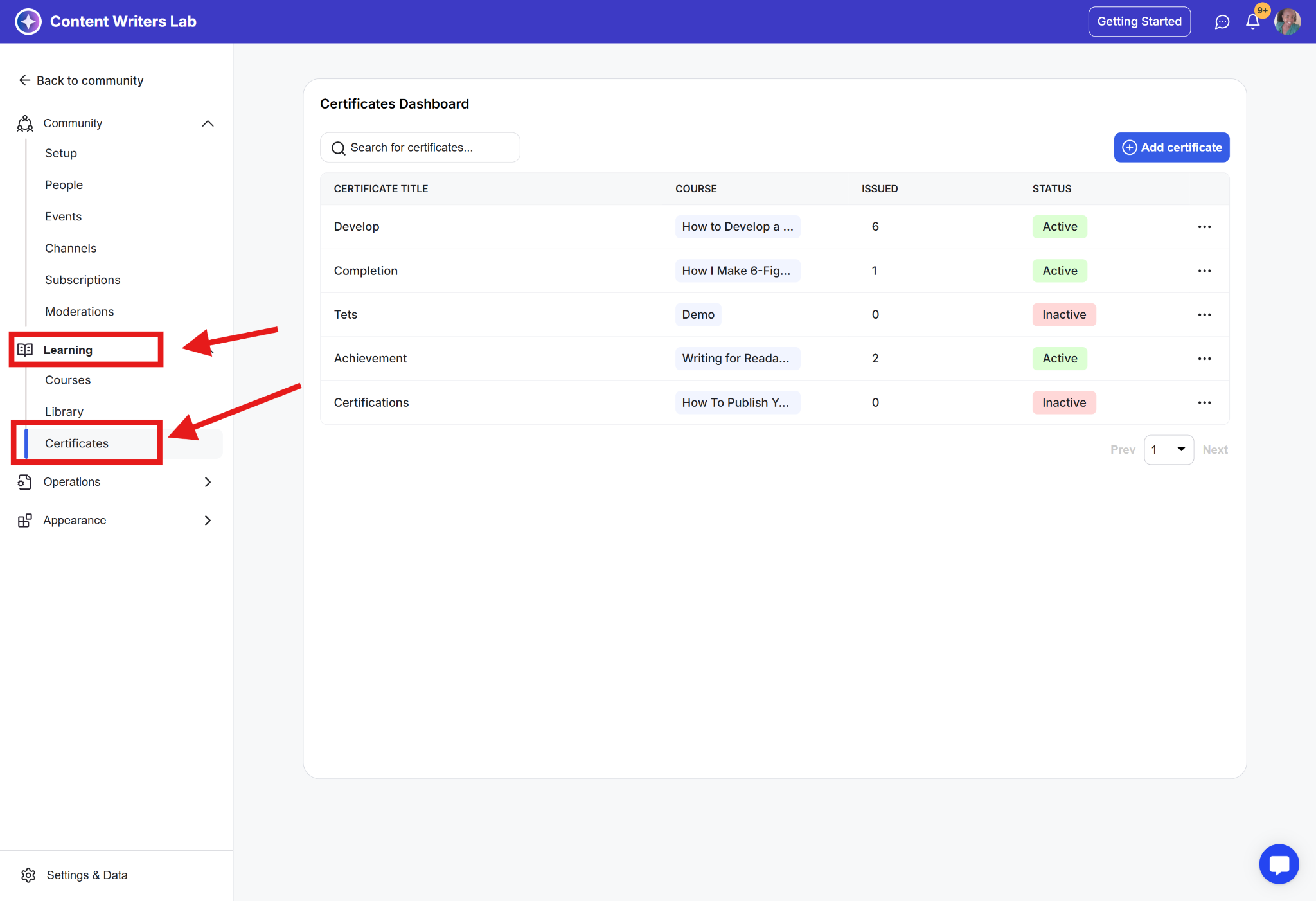 Step 2: Go to Learning on the side menu and select Certificates.