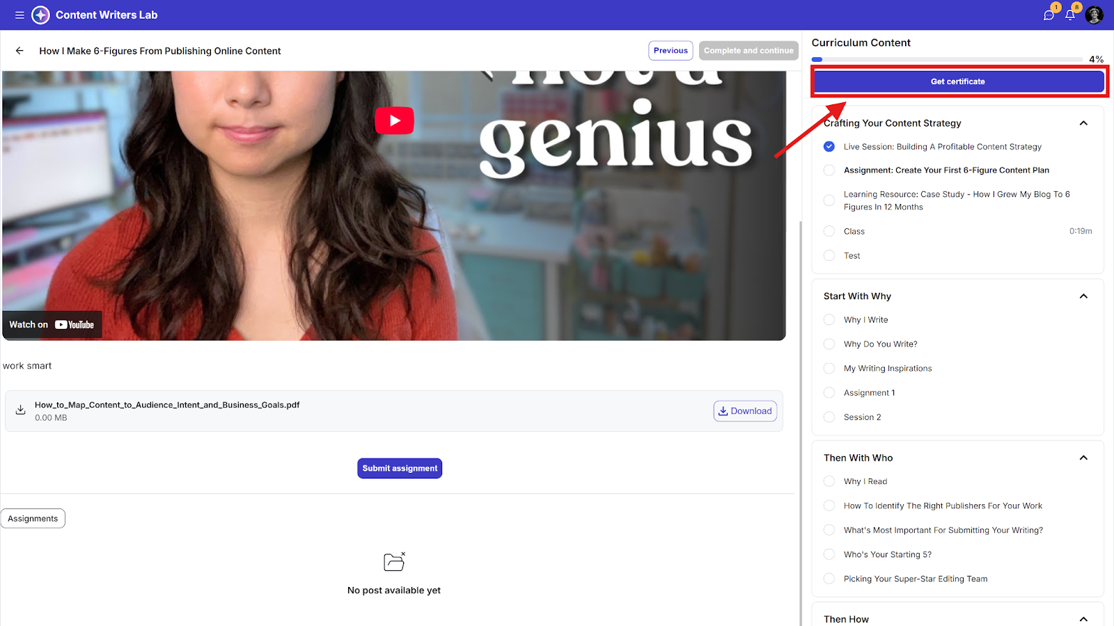 Once the milestone is met, the student will be prompted to claim their certificate. If they finish the entire course, they will see a Get Certificate notification.