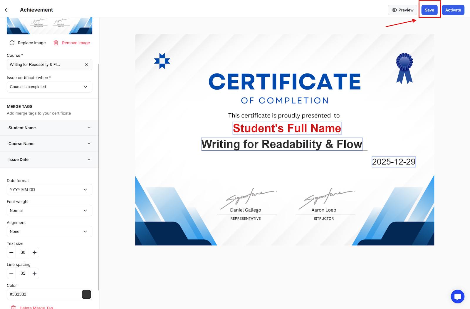 Step 1: Once you are done editing the certificate image, you must click the Save button to apply the changes made.