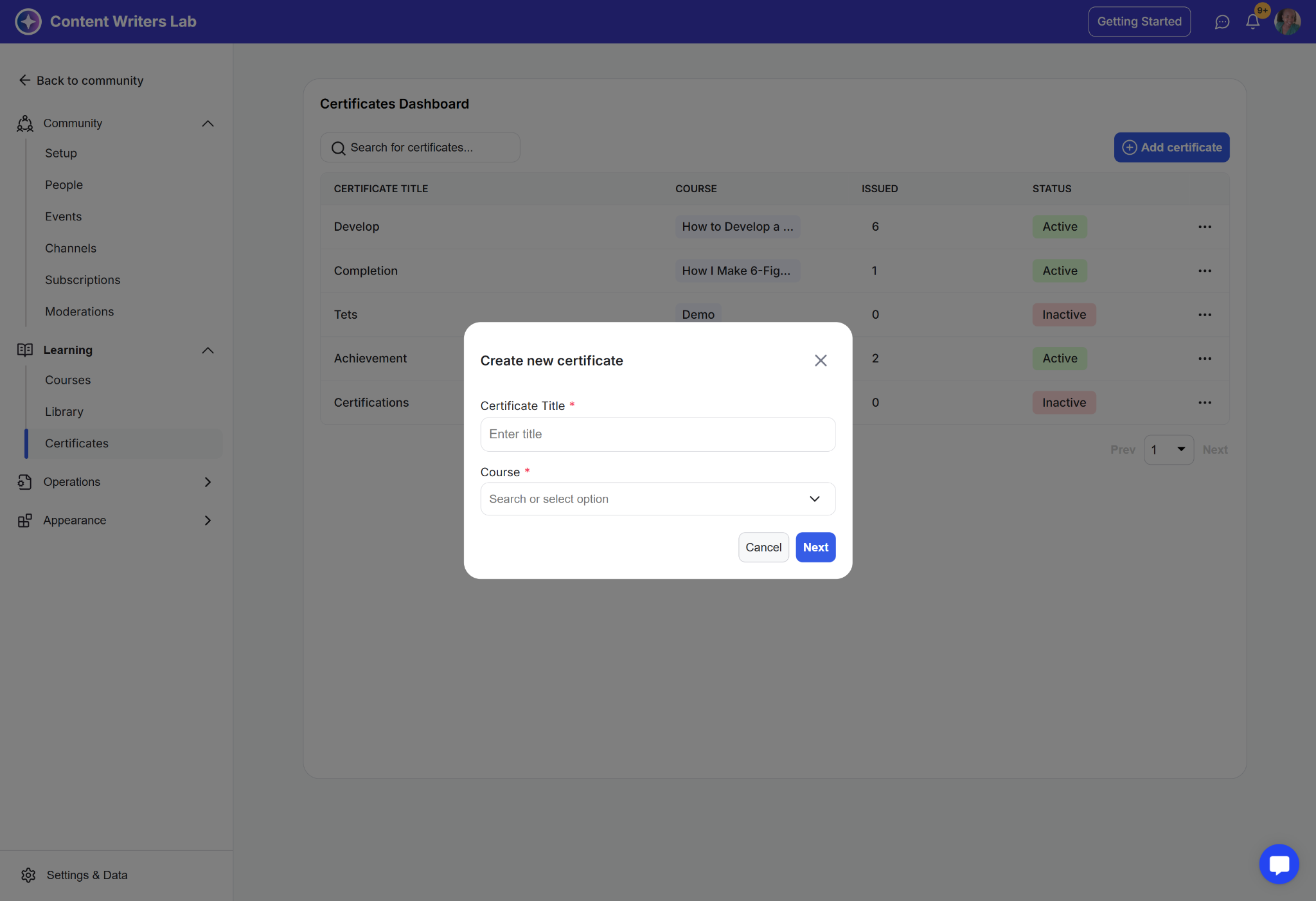 Step 4: Enter the certificate Title and assign it to a course, then click the Next button to proceed.