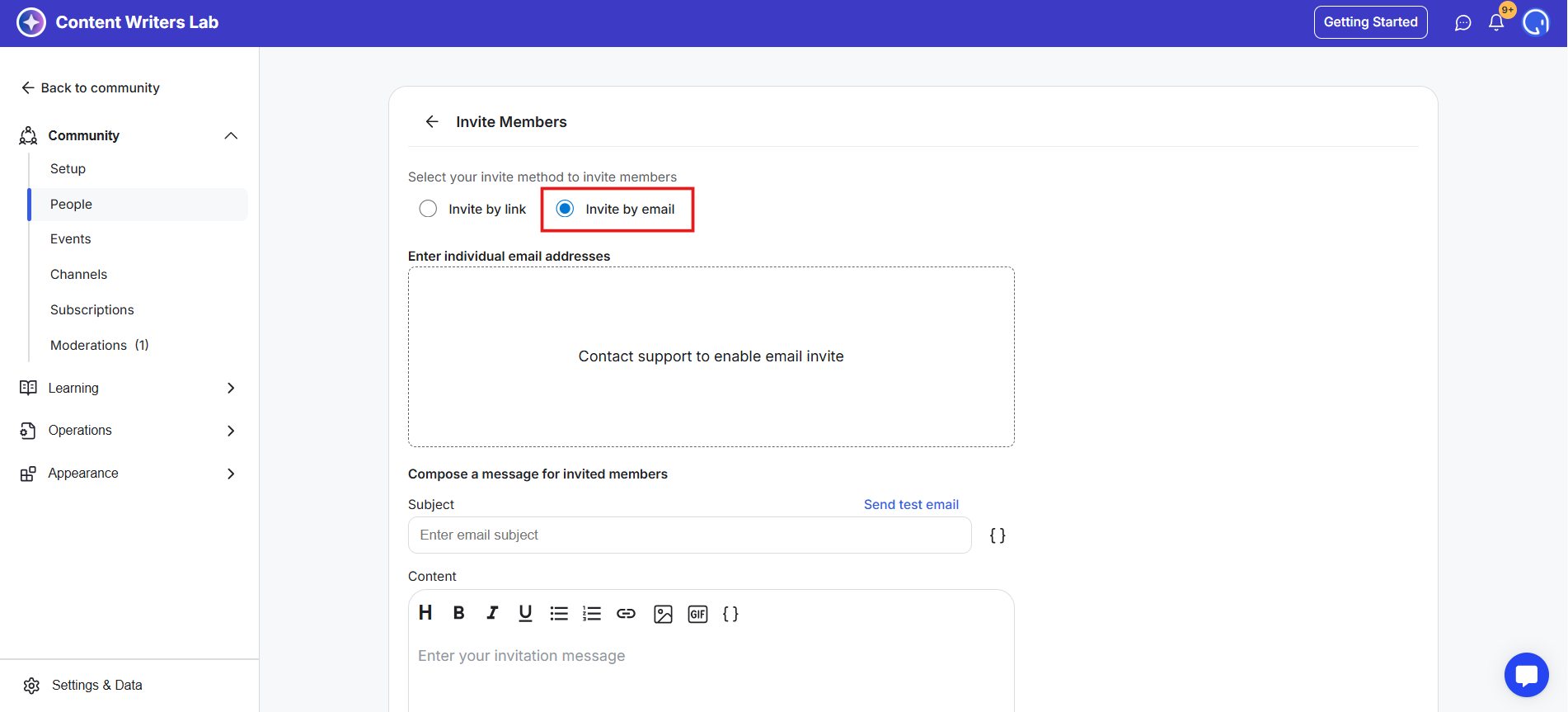 The Invite by Email option lets you invite specific individuals to join your community by entering their email address and full name. You can invite up to 10 people at a time using this method.