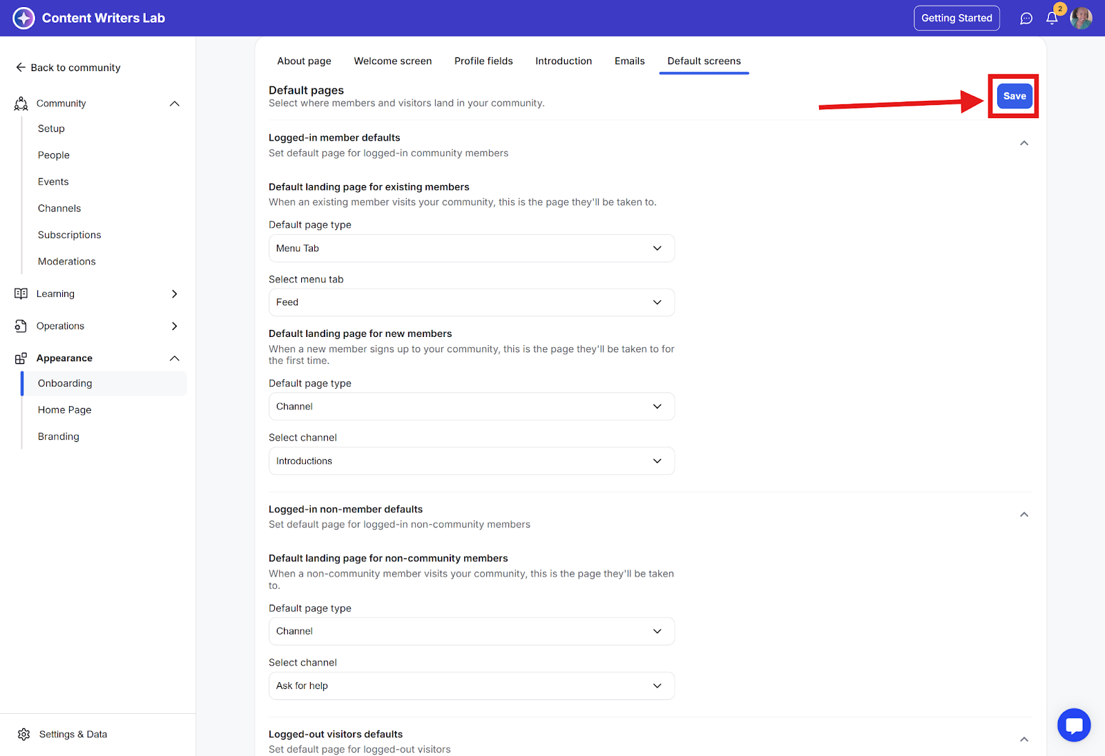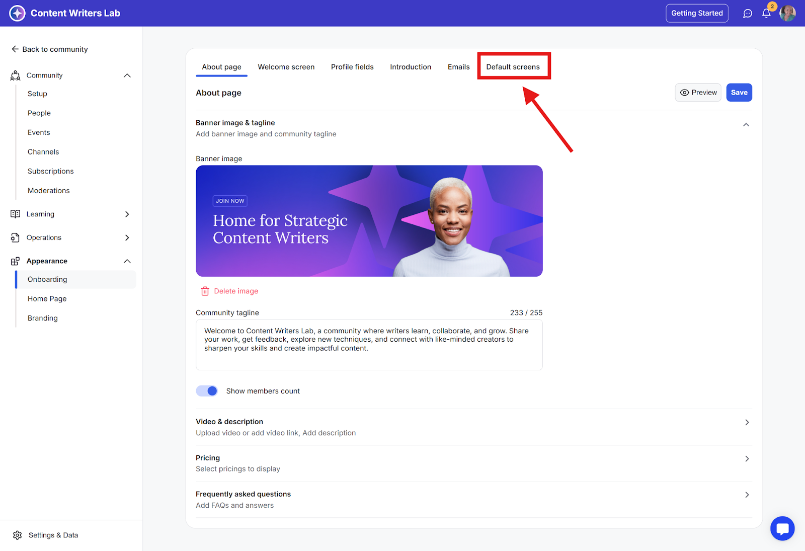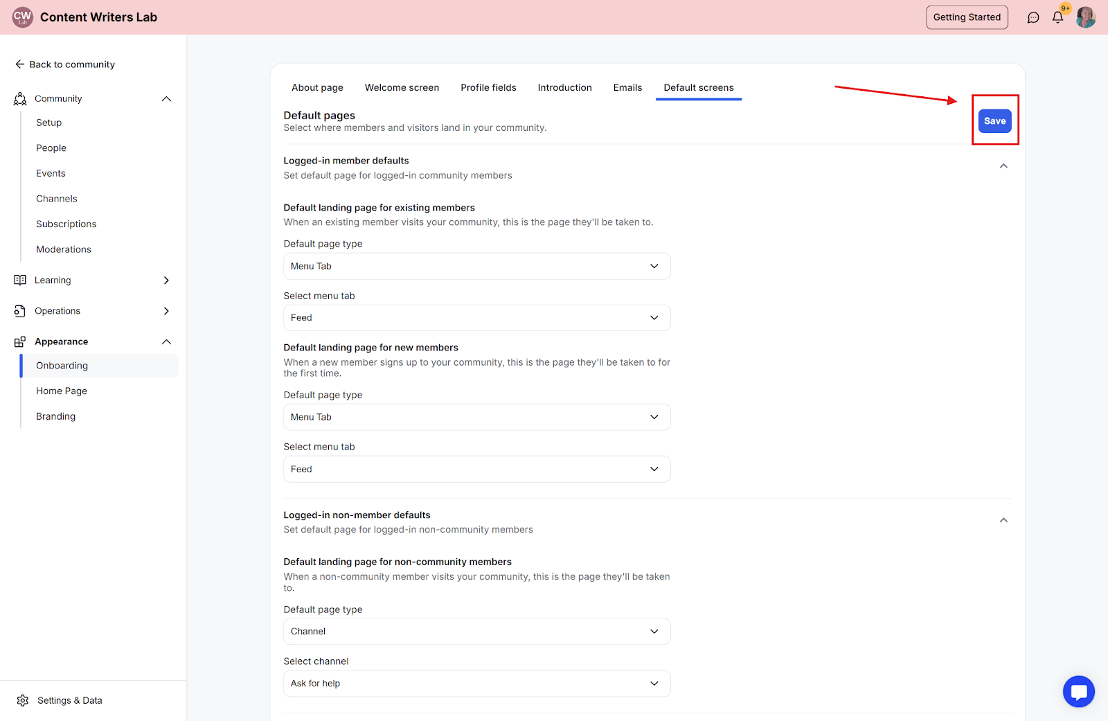 Step 2: In the side navigation menu, click Appearance and then select Onboarding.