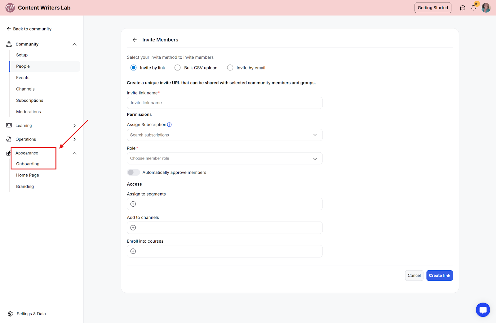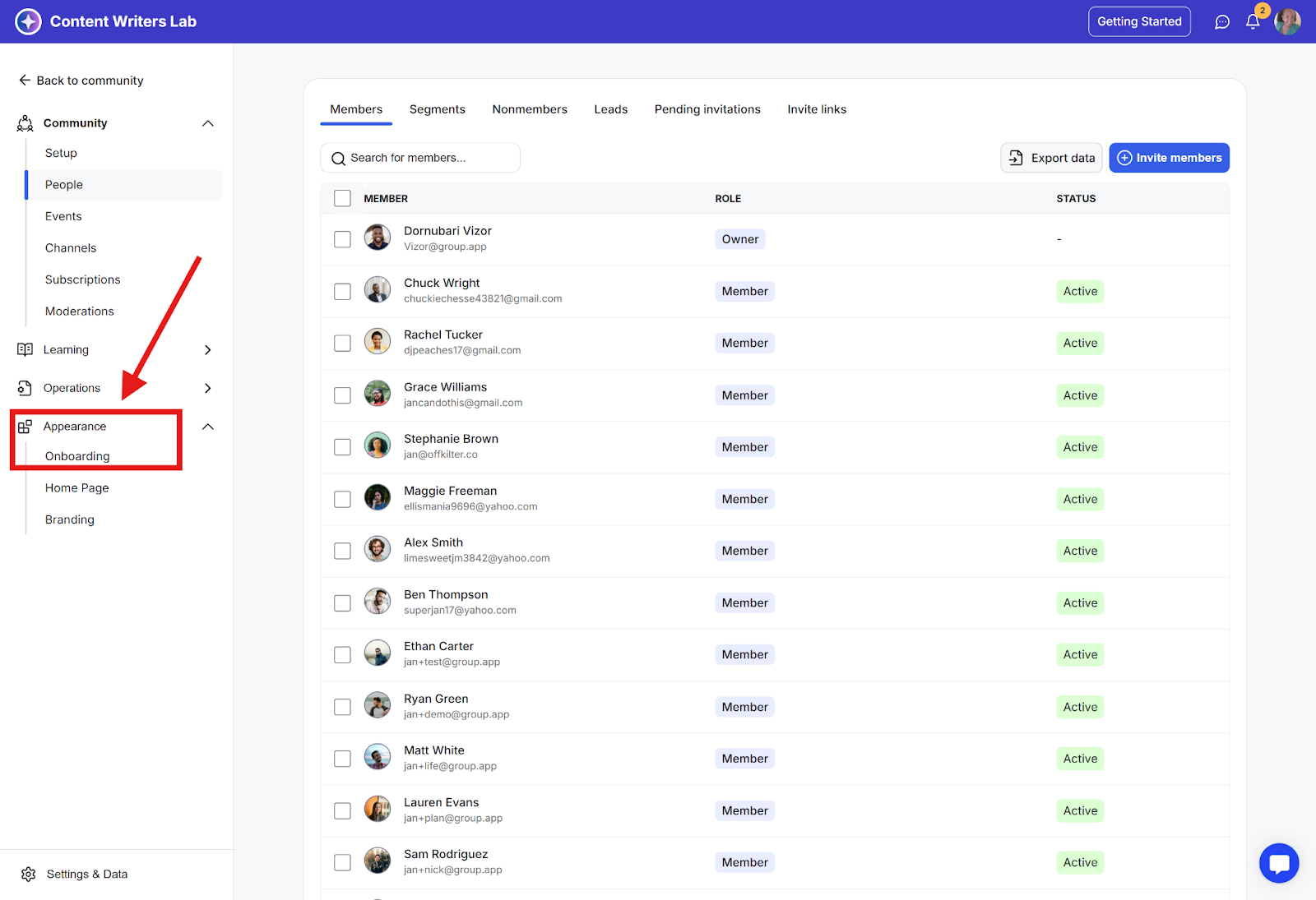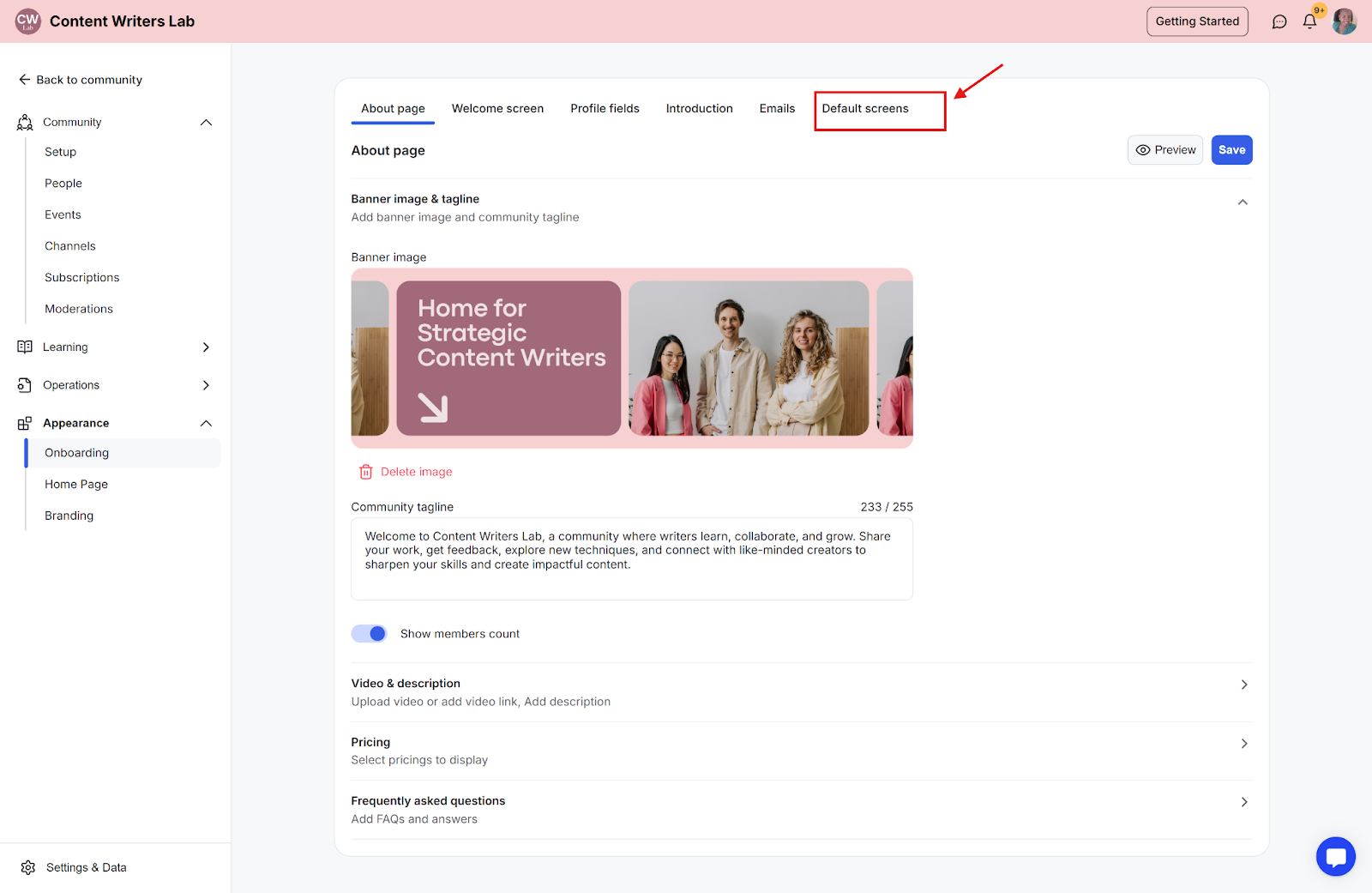 Step 2: In the side navigation menu, click Appearance and then select Onboarding.