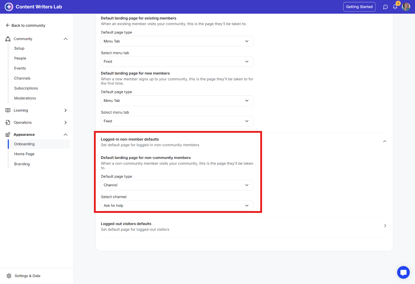 Step 2: Based on the settings above, a logged-in non-member will always land on the Ask For Help channel page.
