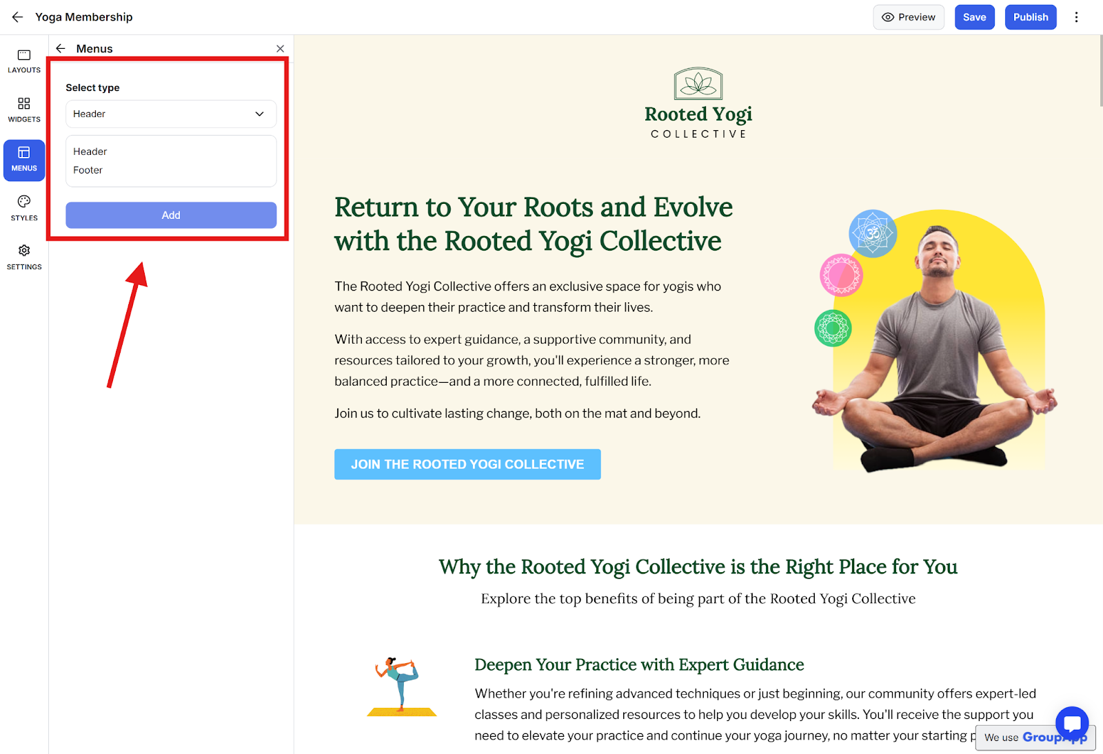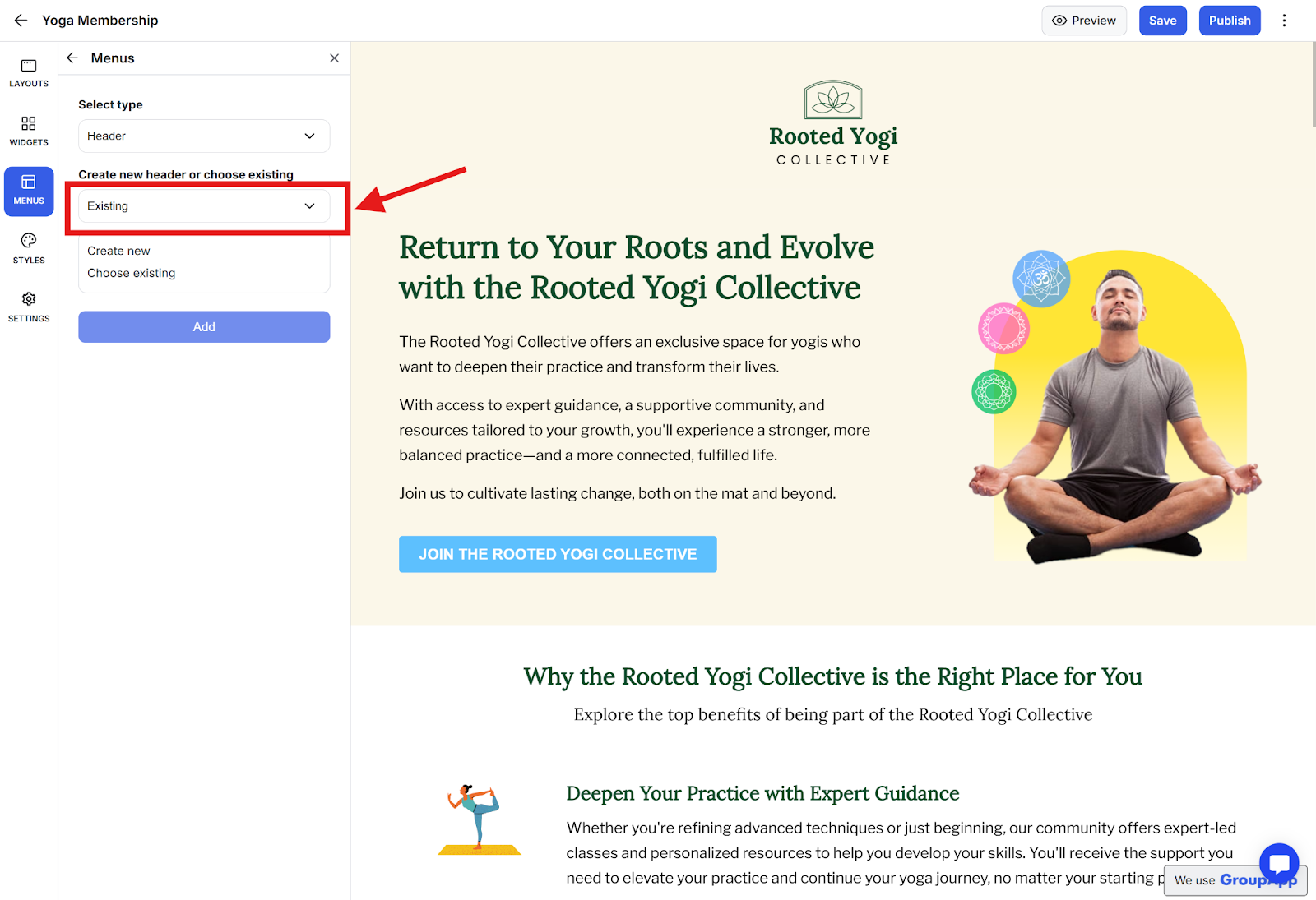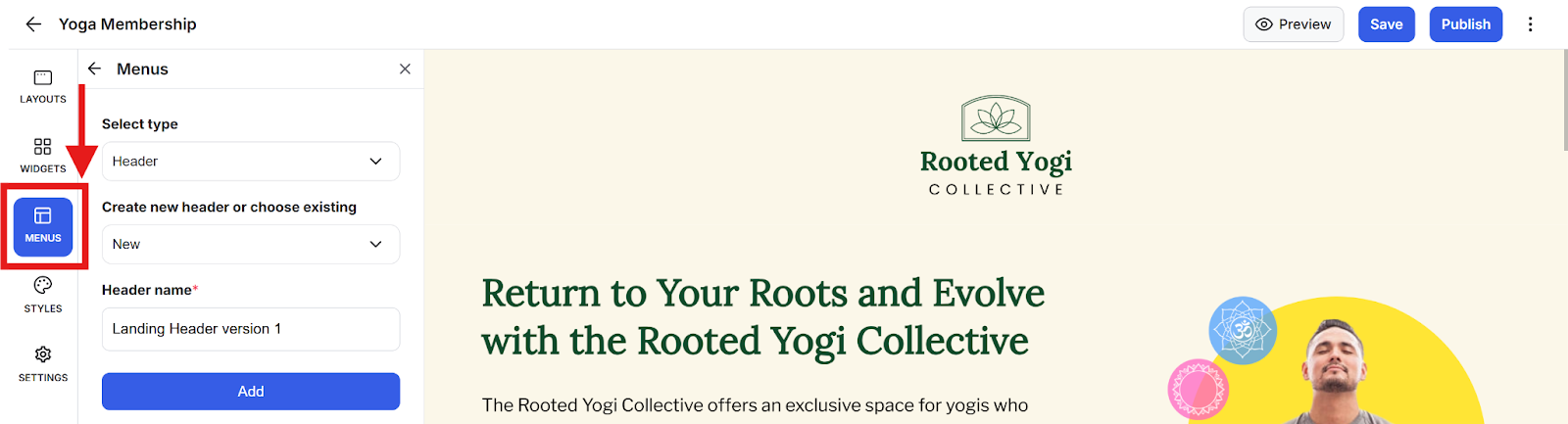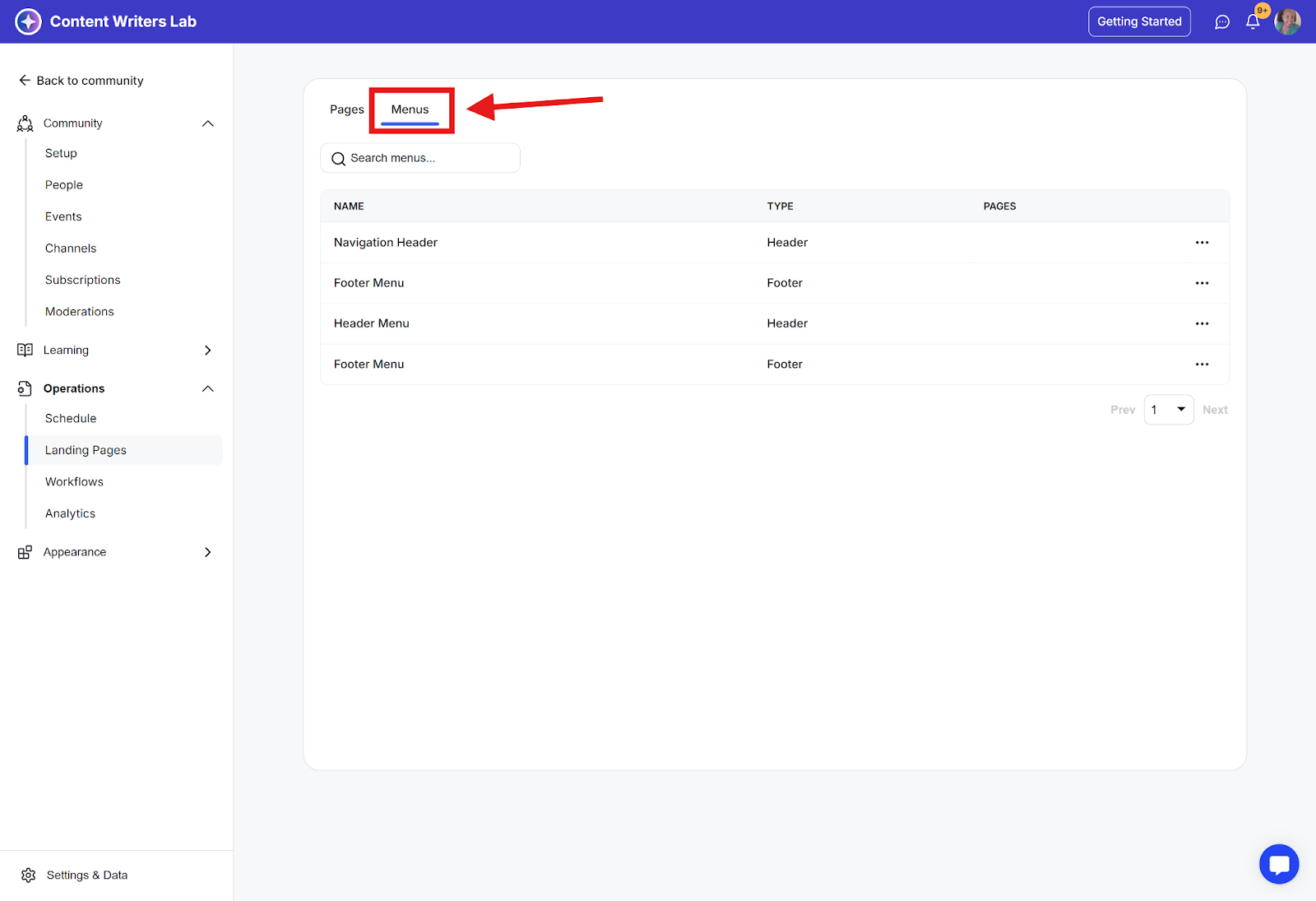 Step 2: On the landing pages dashboard, select the Menus tab.