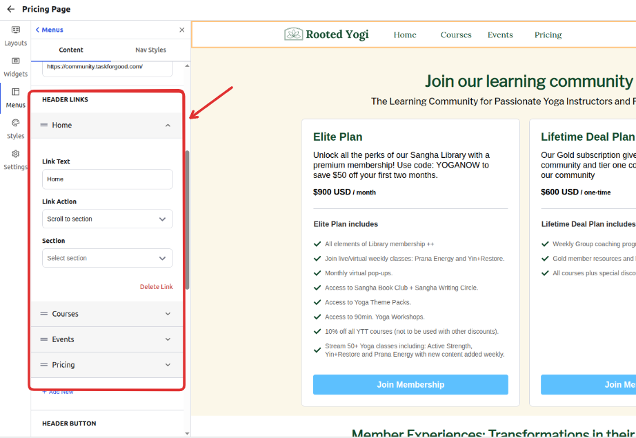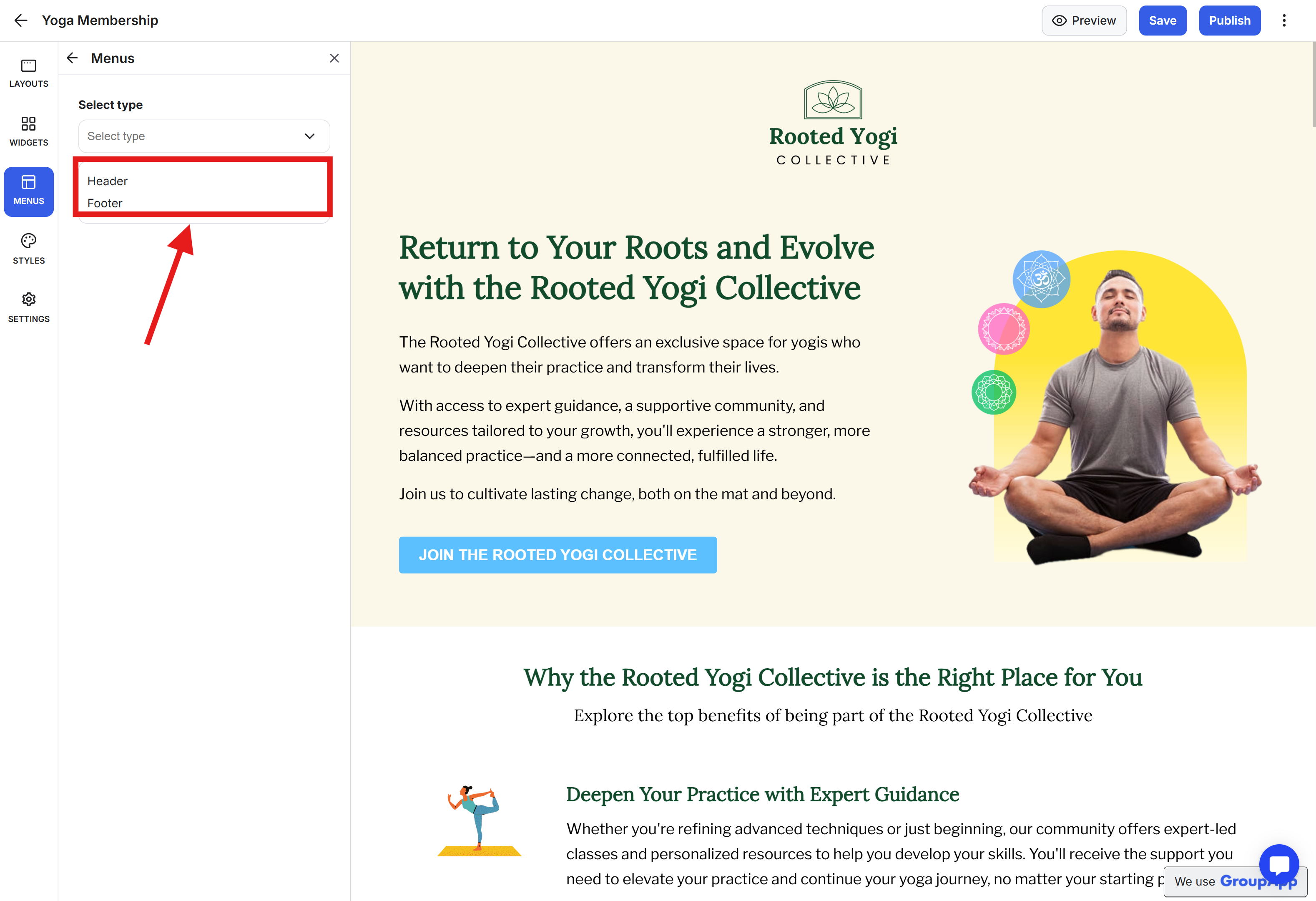 Duplicate, delete, or rename a header and footer created, and access the created header and footer from the landing page dashboard when you click the Menus tab.
