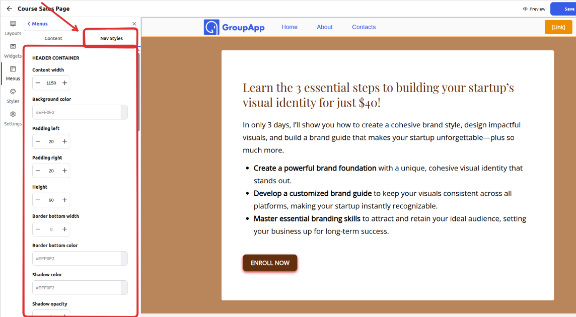 Step 1: After you are done adding content, move to the Nav Styles tab.