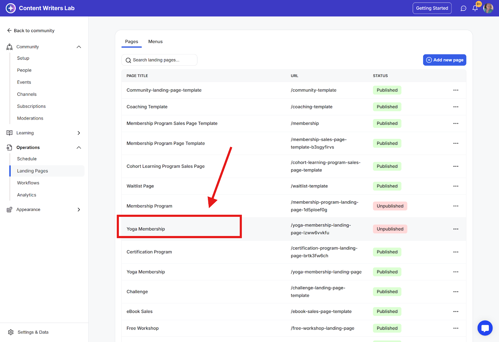 Step 2: Click on Operations in the side menu and select Landing Pages.