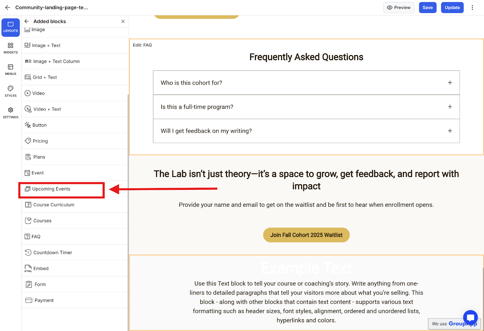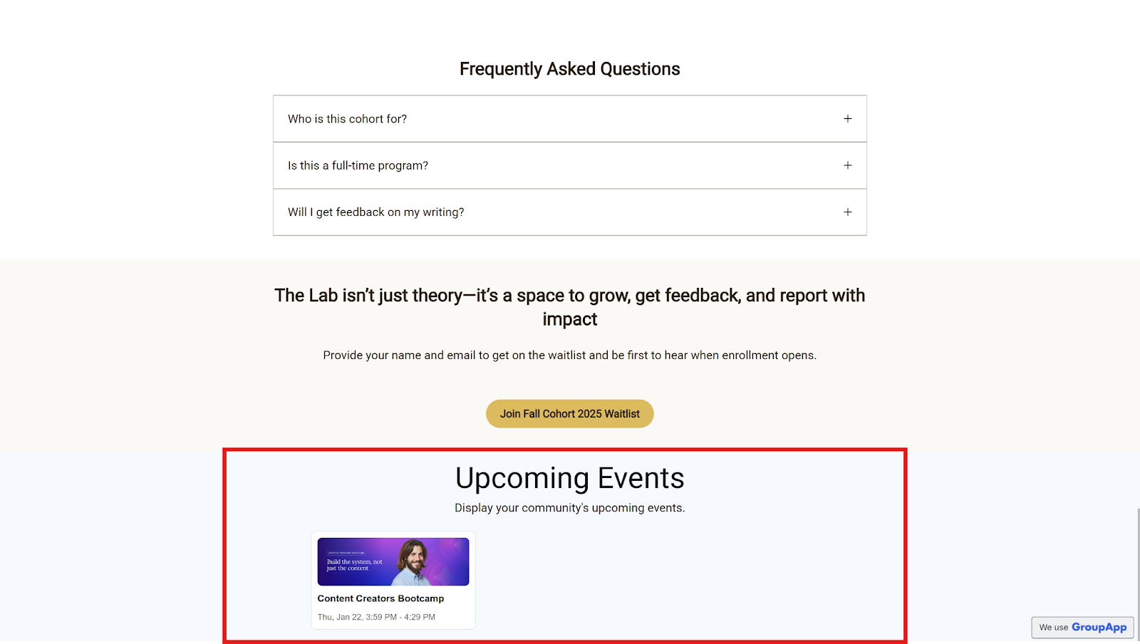 This allows you to consistently present either training programs, workshops, or free events that you have available for potential members or members of your community to view directly on your landing page.