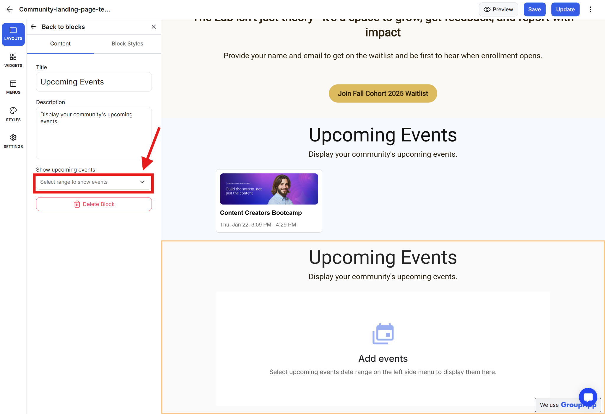 Step 7: Select the date range to showcase the upcoming events, then adjust the Displayed events count. Only events that are upcoming and are published will show up.