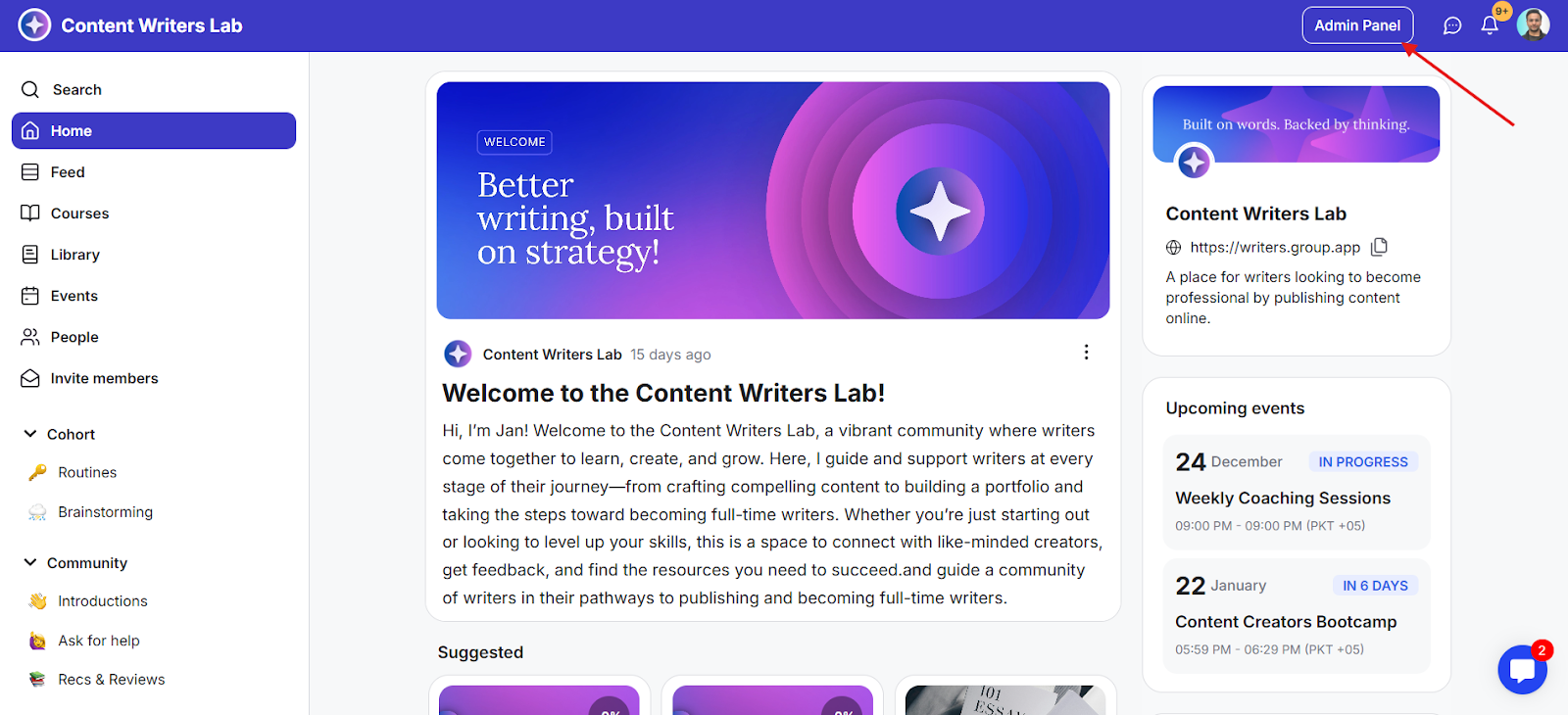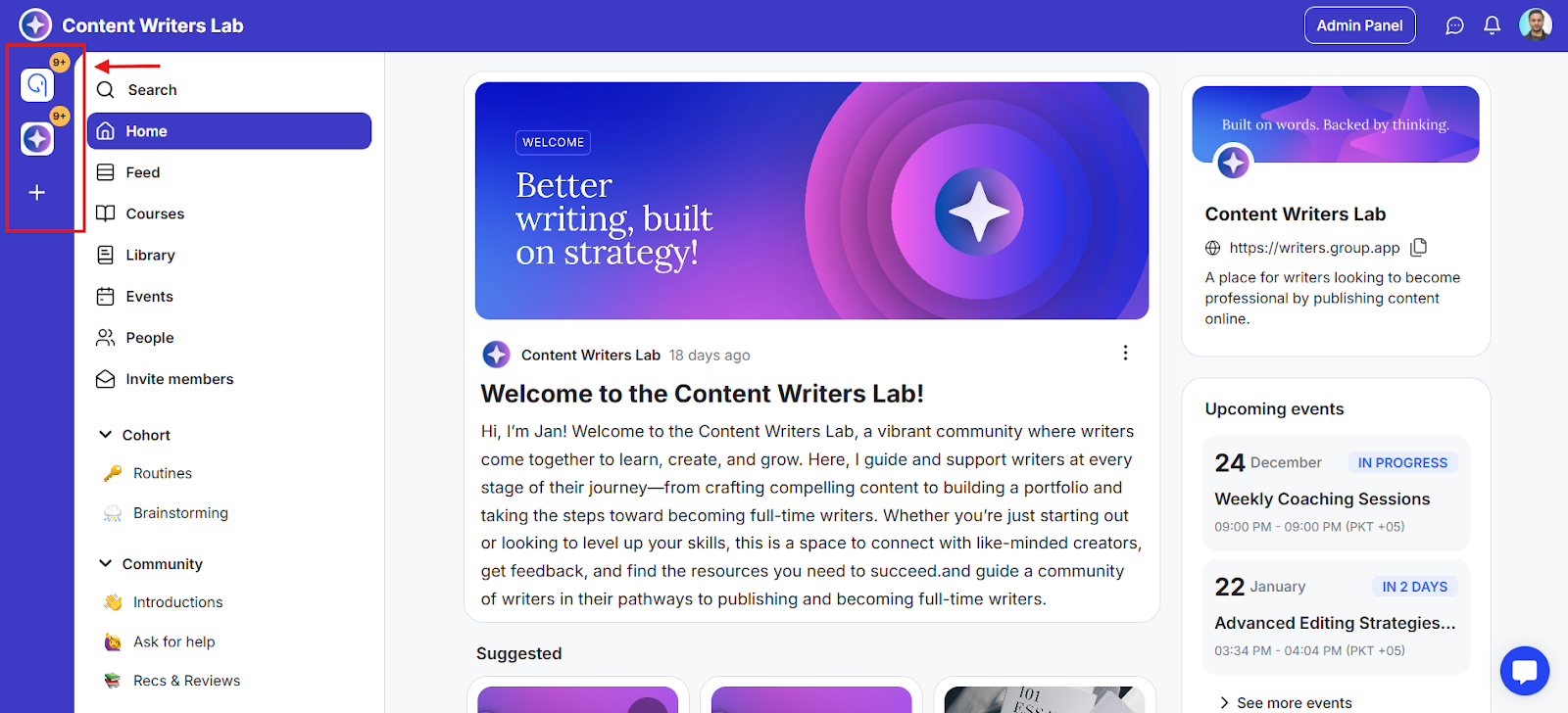 The switcher eliminates the need to visit my group.app to access your communities. You can also quickly create a new community by clicking the + icon, and view unread notification counts from other communities you are part of.