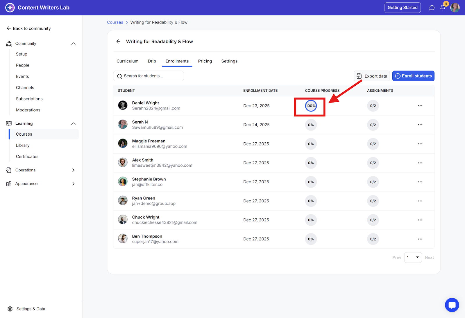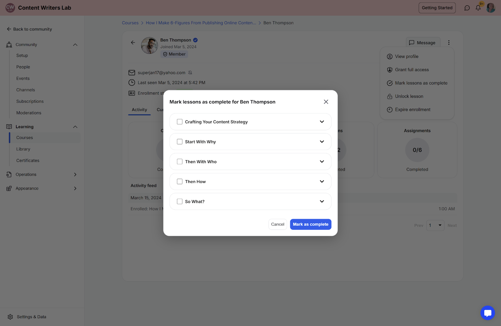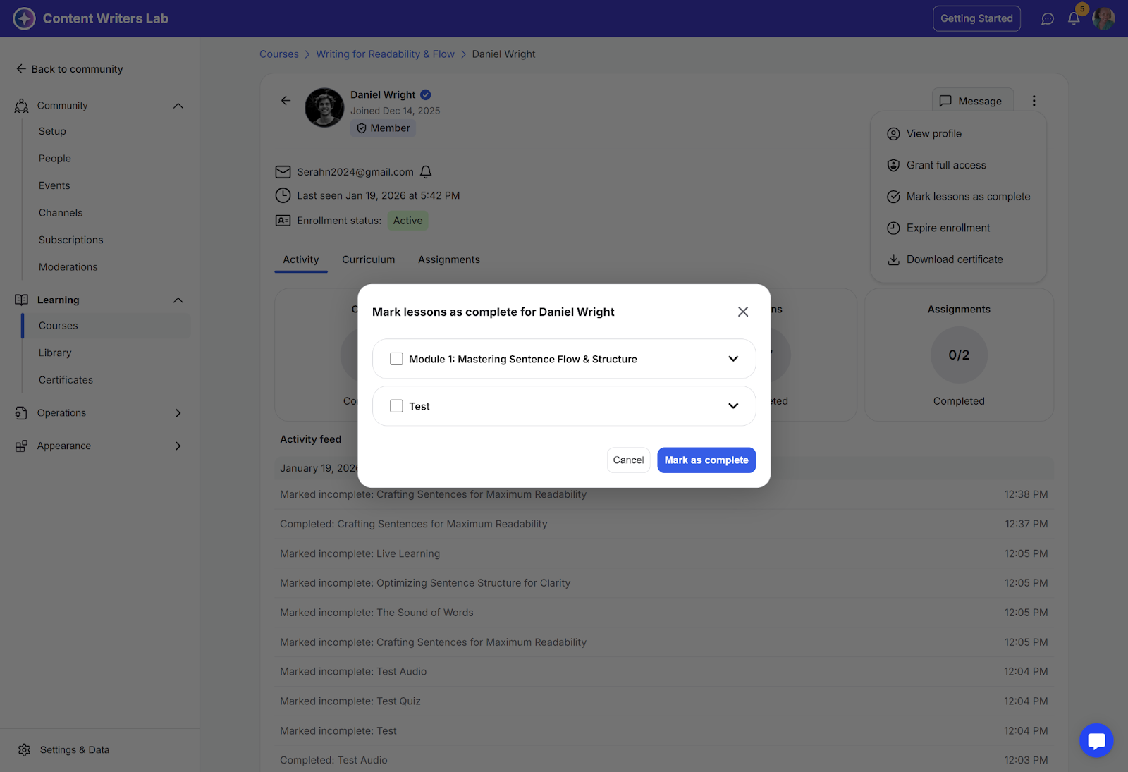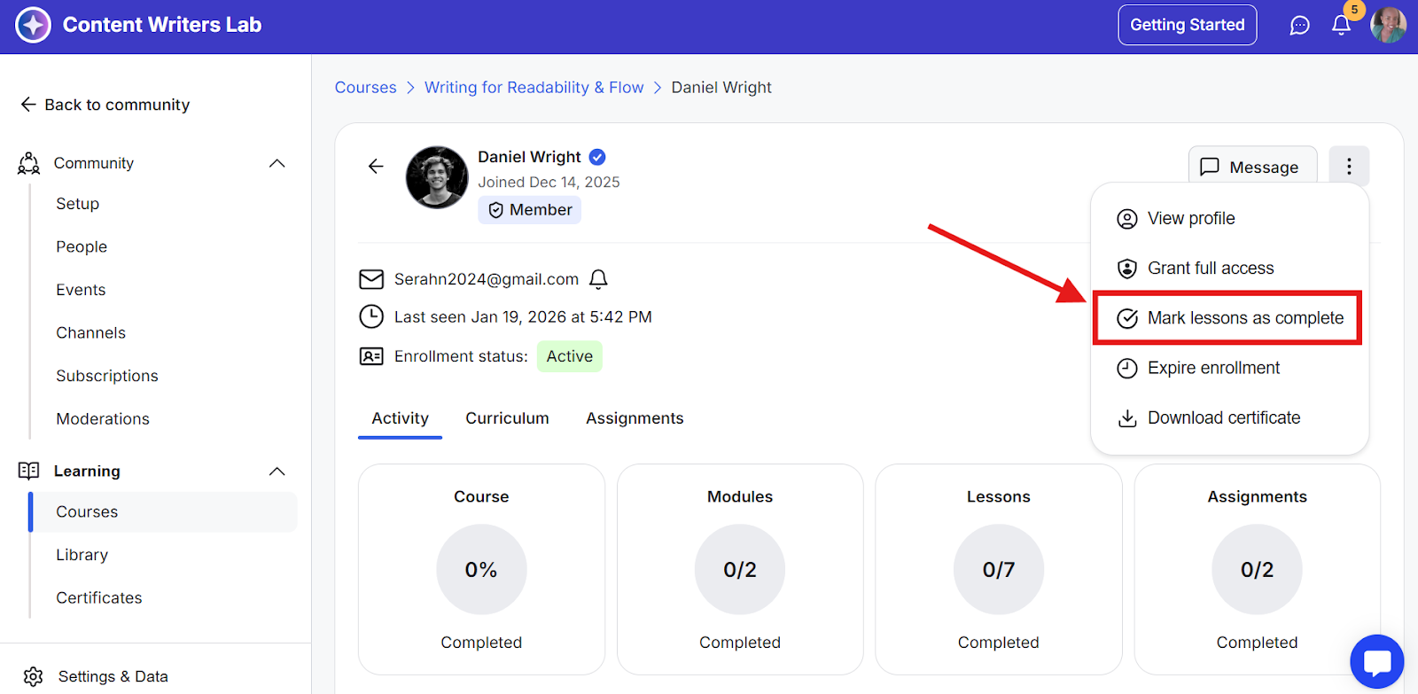 This guide explains how to manually mark lessons as complete or incomplete for students. Use this feature to help students catch up, skip lessons to unlock future content, or manage progress for certificate eligibility.