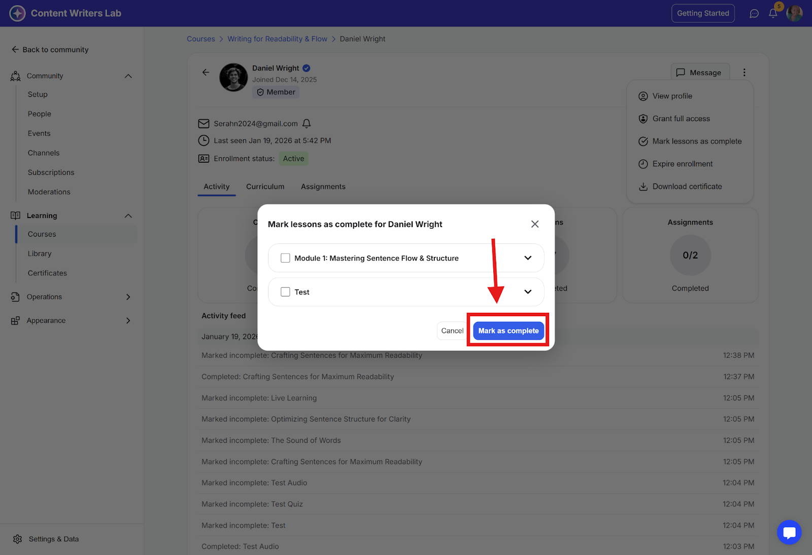 Step 6: In the pop-up, check the boxes next to the lessons you wish to mark as complete or incomplete.