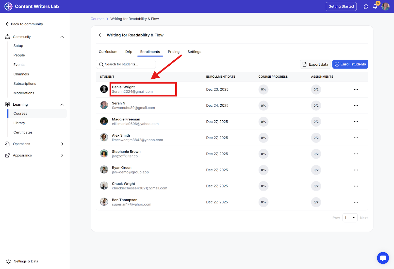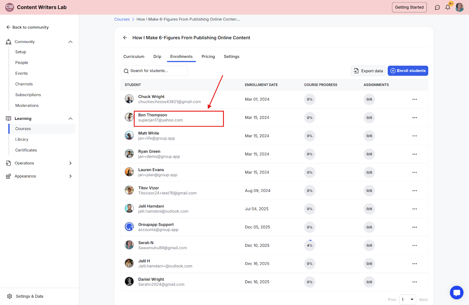 Step 3: Select a course by clicking on its name, then go to the Enrollments tab.