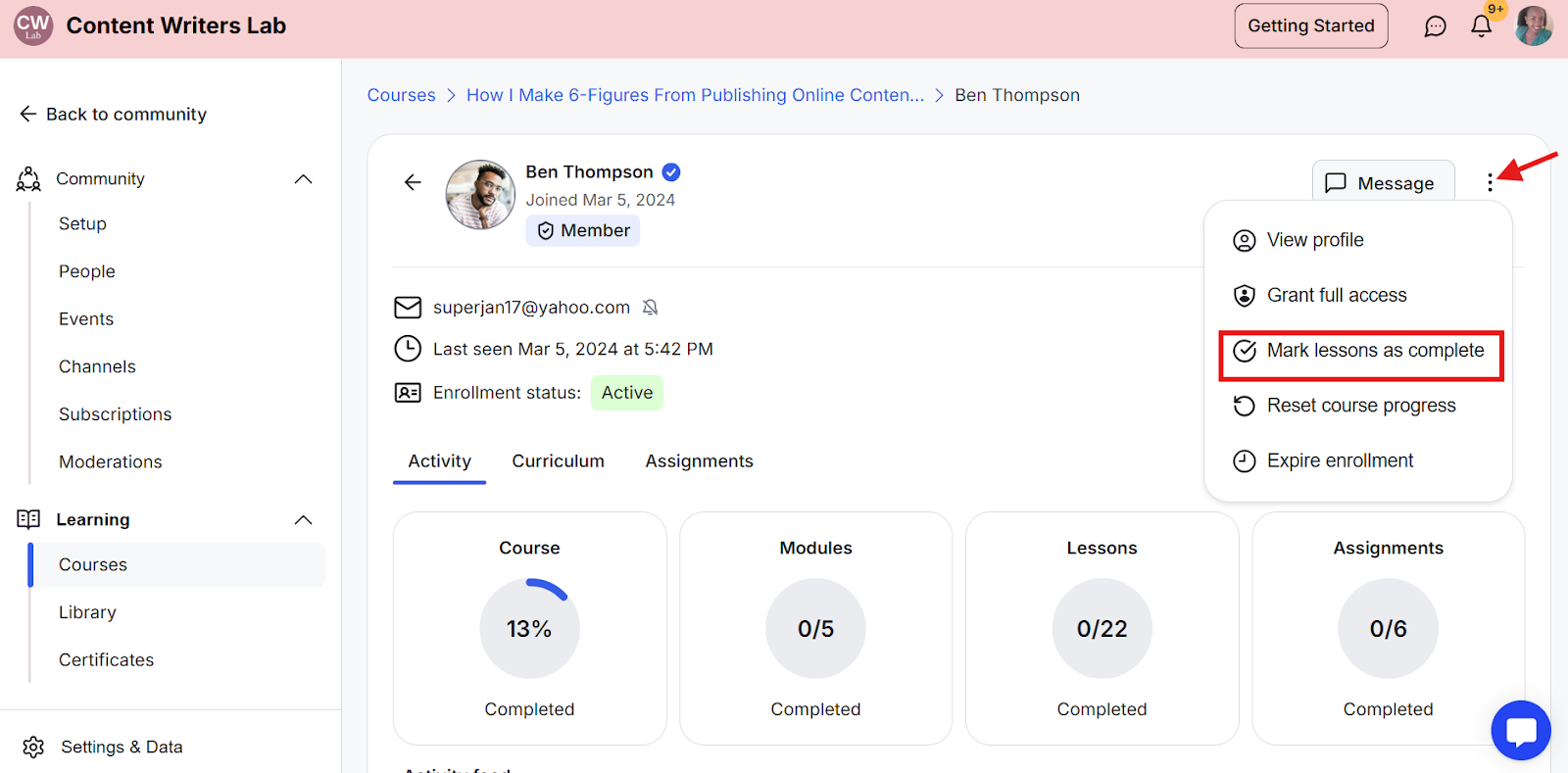 Step 5: Click the three-dot menu on the top-right and select Mark Lessons as Complete or Mark Lessons as Incomplete.