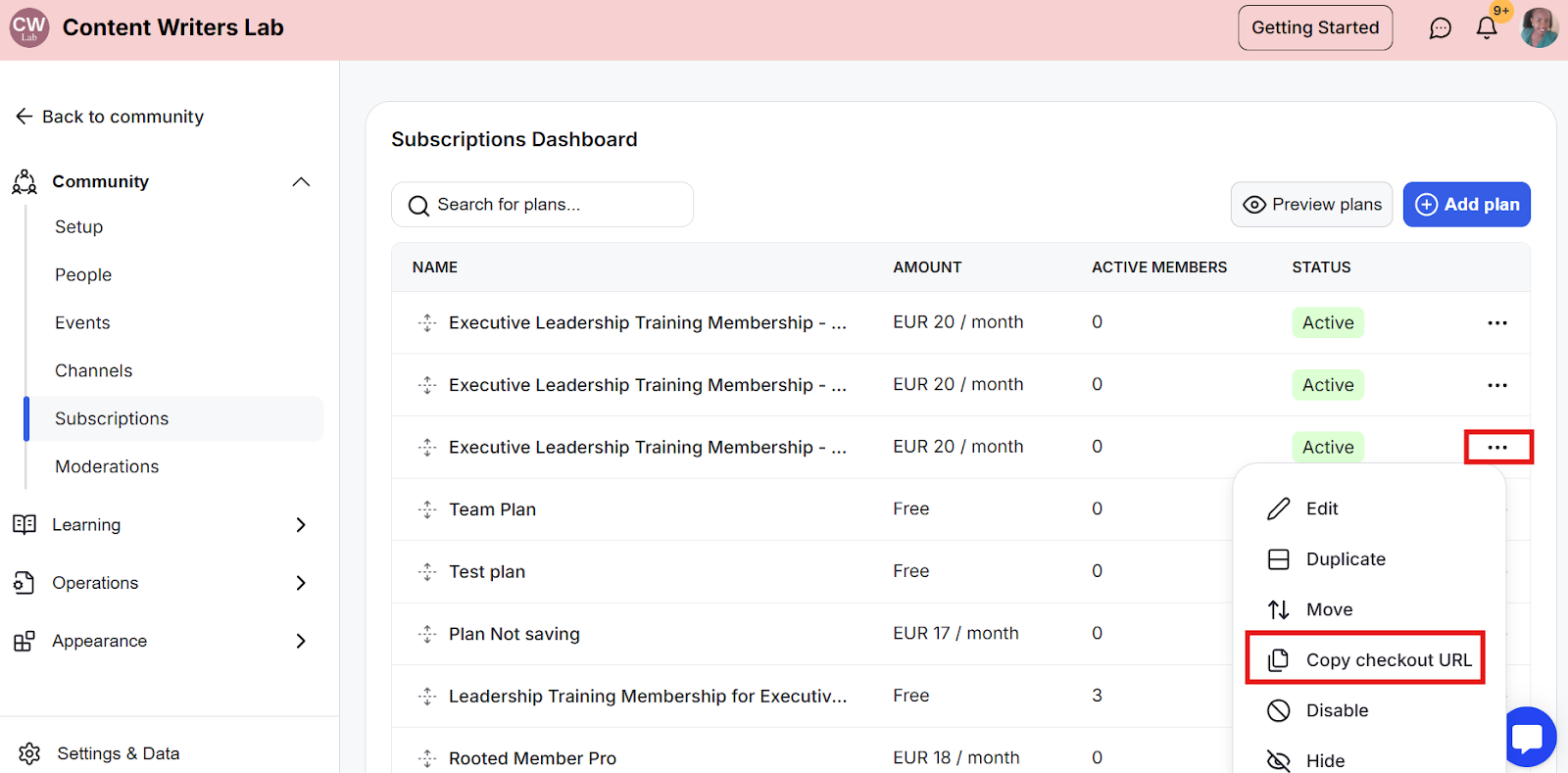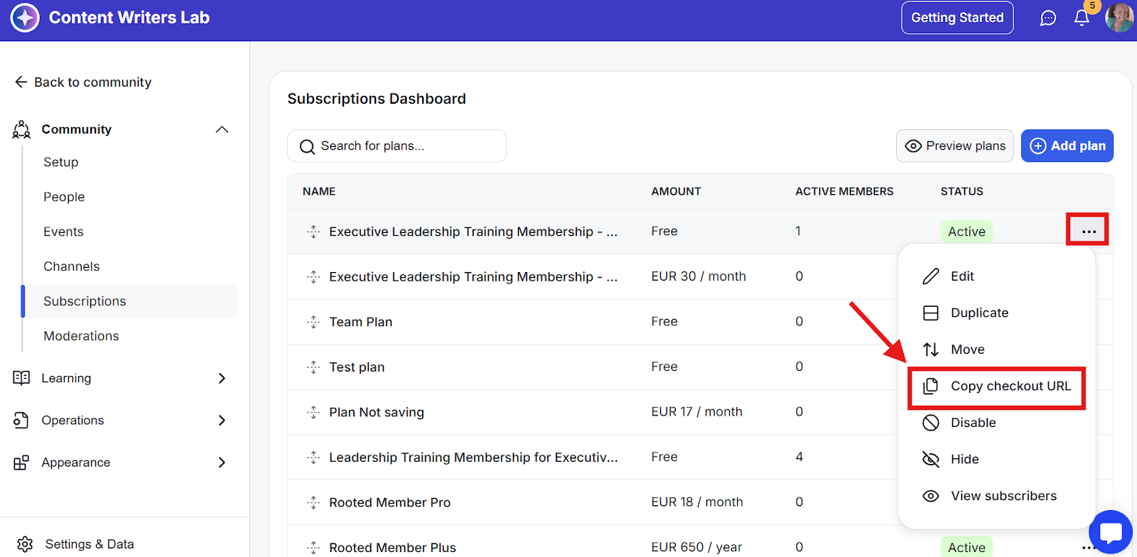 Step 3: Find the subscription you would like to get the checkout URL for and click on the 3 dots menu on the right of it. Select Copy Checkout URL. This will copy the subscription plan checkout page to your clipboard.