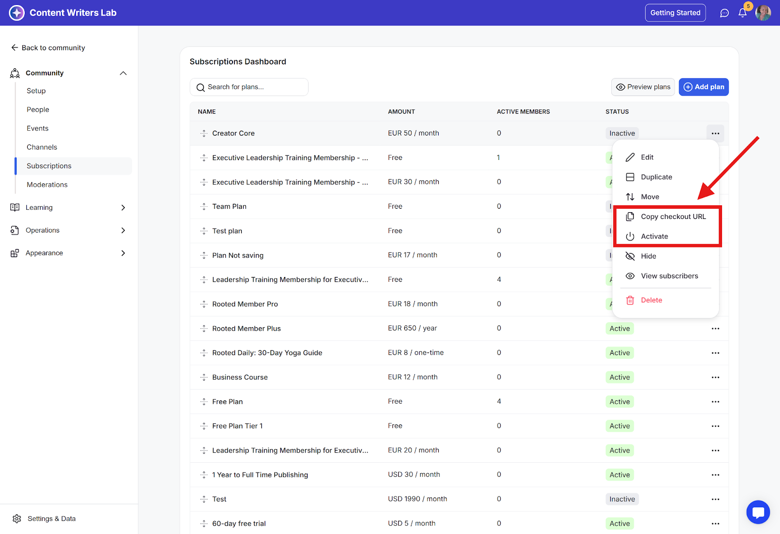 Step 14: Click on the three-dot icon to activate the plan and copy the checkout link to share.