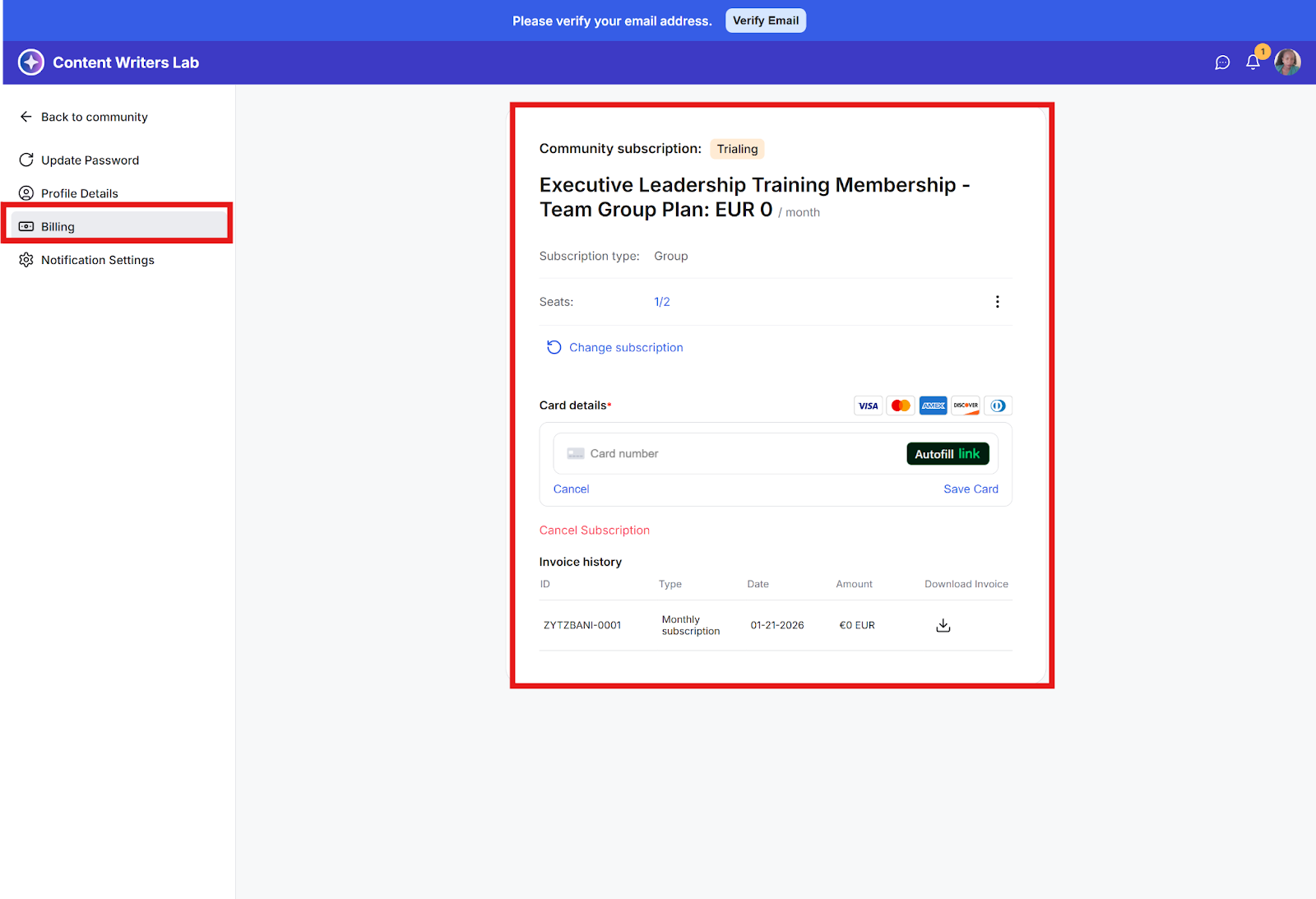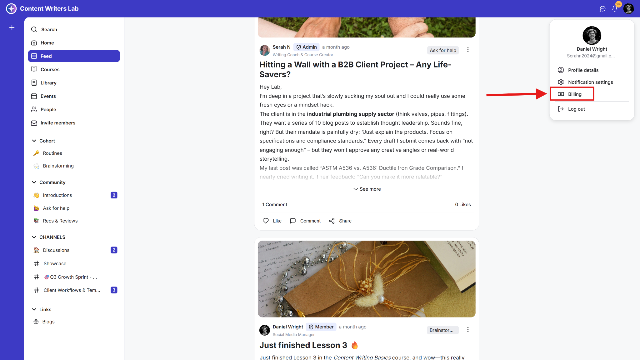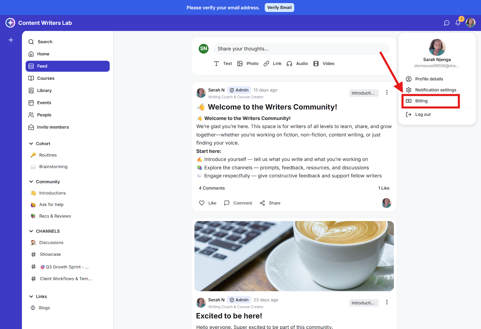 Step 1: Click your profile icon in the top-right corner of your community and select Billing.