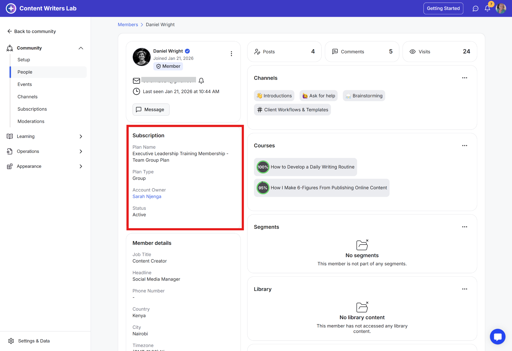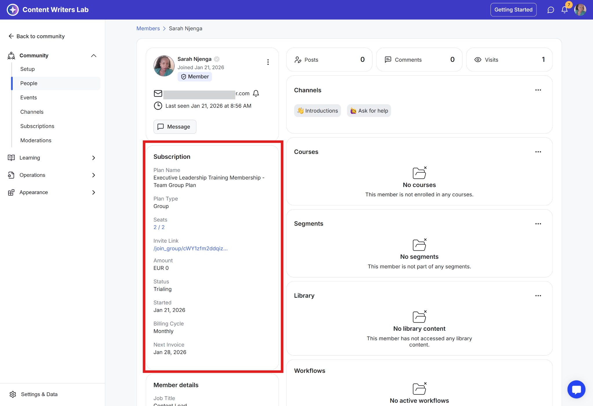 Step 3: Click a member to open their profile. If the member is a sub-account, you’ll see the Account Owner field along with the plan type as Group, on their profile with the owner’s name. This shows that the member is a part of a group subscription bought by the specified account owner.