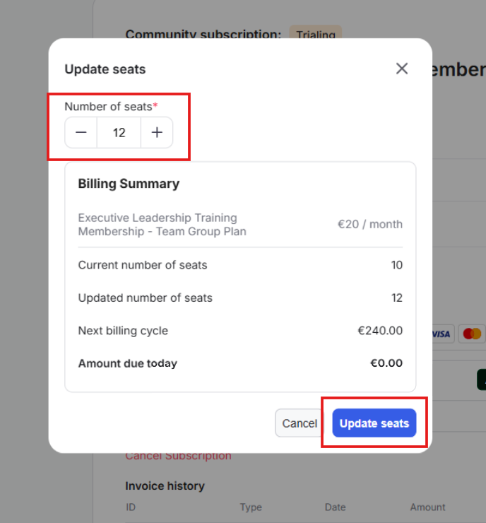 Step 5: If you increase or decrease the number of seats, you’re pro-rated. The payment processor will handle prorated credits automatically. Once done, click on Update Seats.