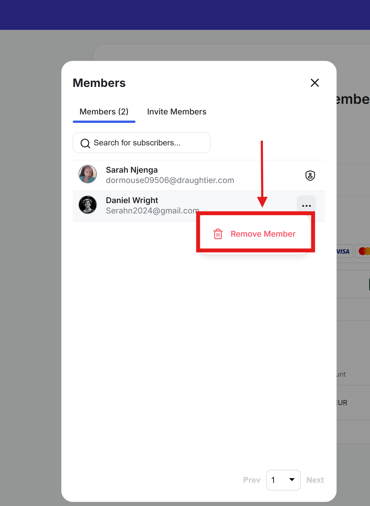 Step 3: Next to a sub-account name, click on the three-dot icon. This will show the option to Remove Member. Once you click, the sub-account will be removed from the subscription, and the seat will become vacant.