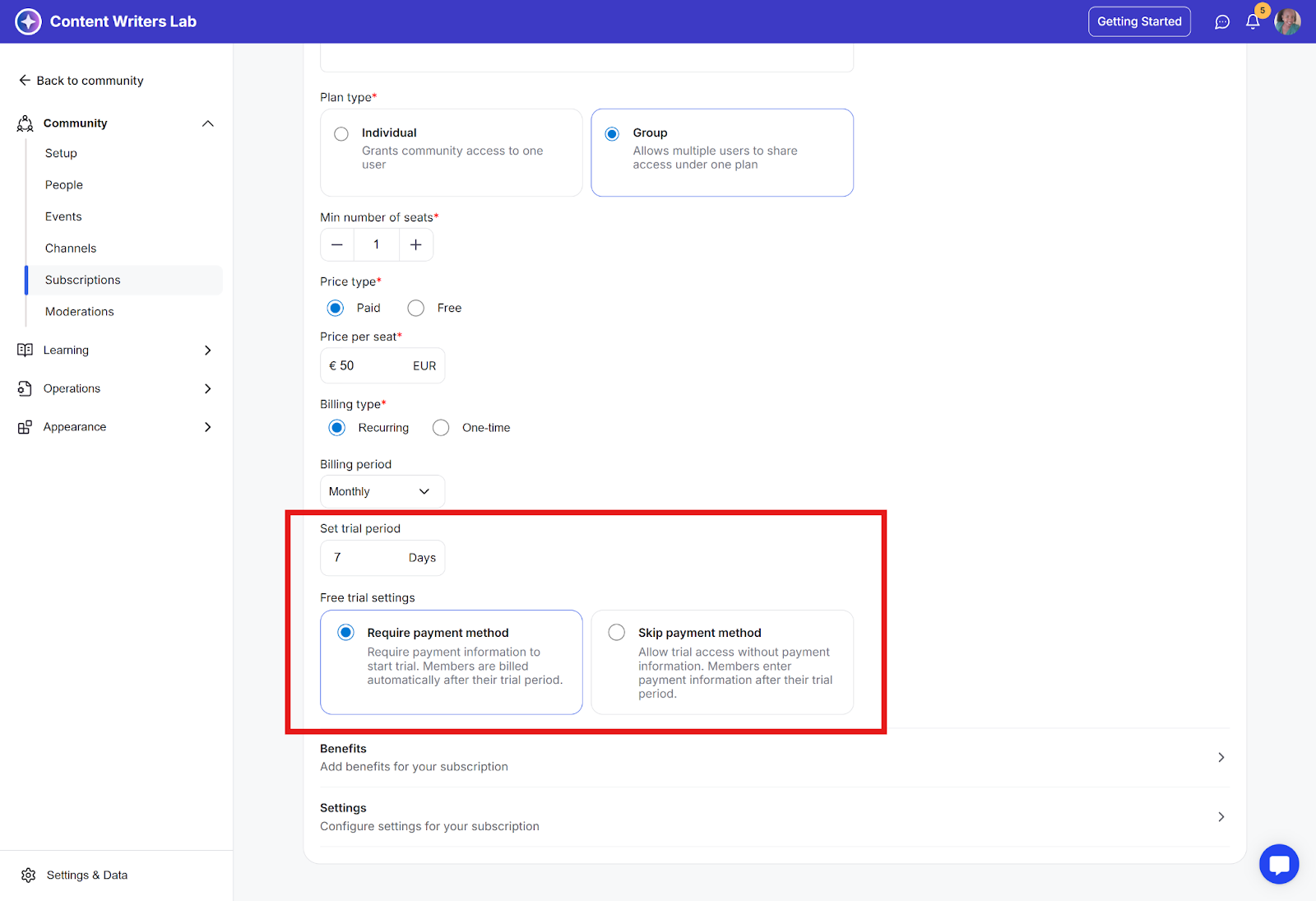 Step 10 (Optional): You can offer a trial with or without a payment method. No-card trials reduce friction for corporate buyers, while card-required trials help qualify buyers and prevent drop-offs later.
