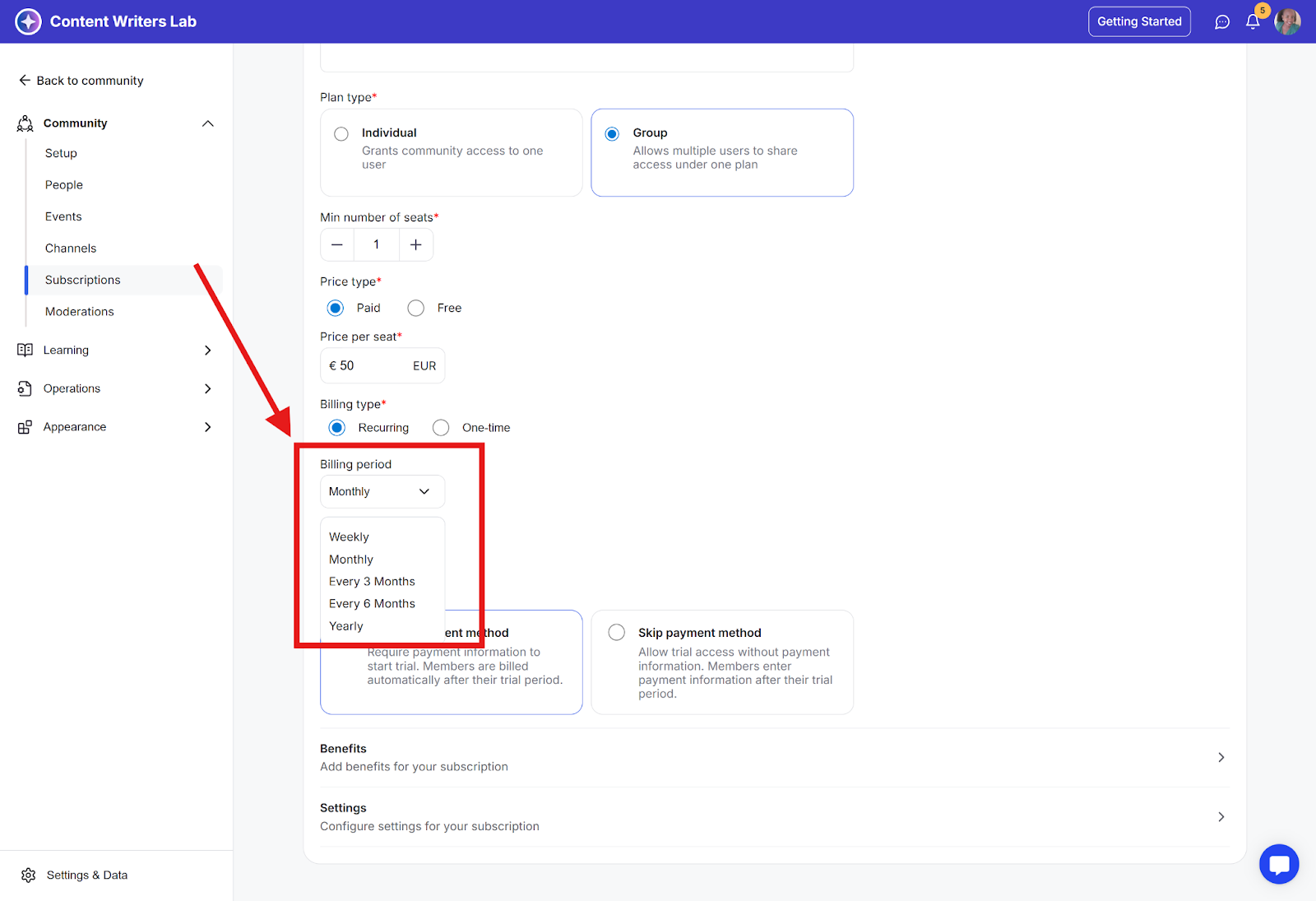Step 9: If you chose a recurring pricing type, set the billing period (weekly, monthly, every 3 months, biannually, or yearly).