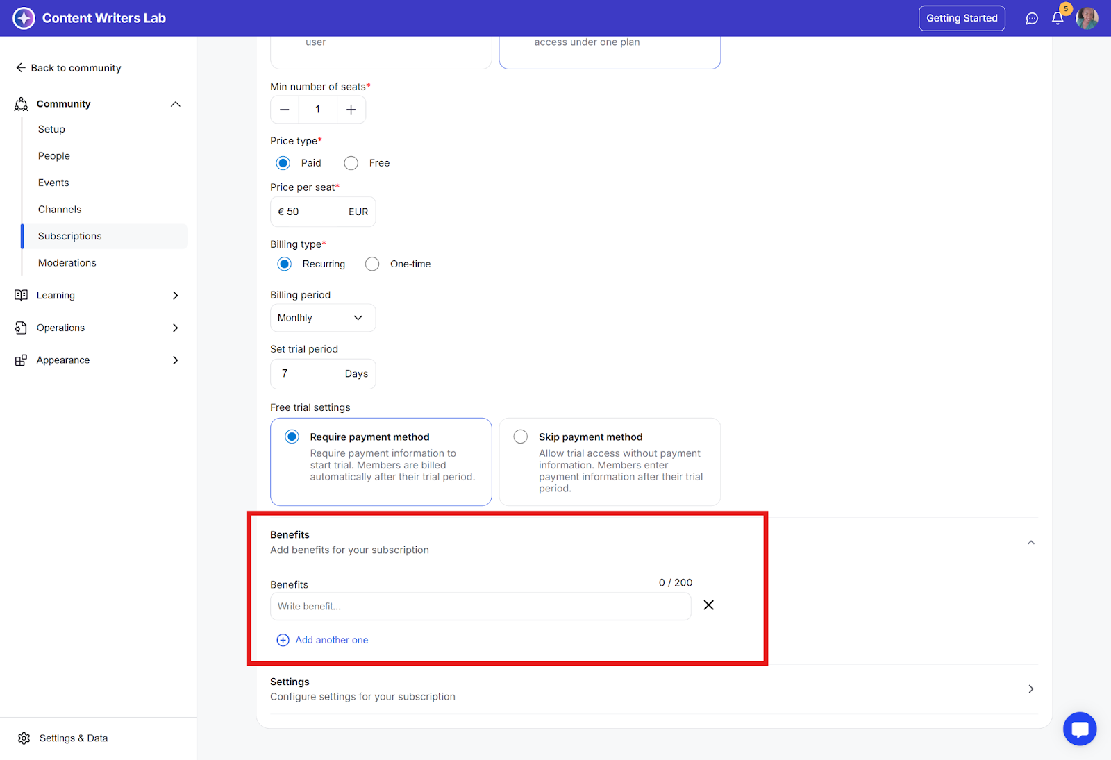 Client success or partner programs: Offer your B2B clients a team plan that includes courses, community, and resources. As their team grows, they can add seats instantly, allowing you to capture expansion revenue.