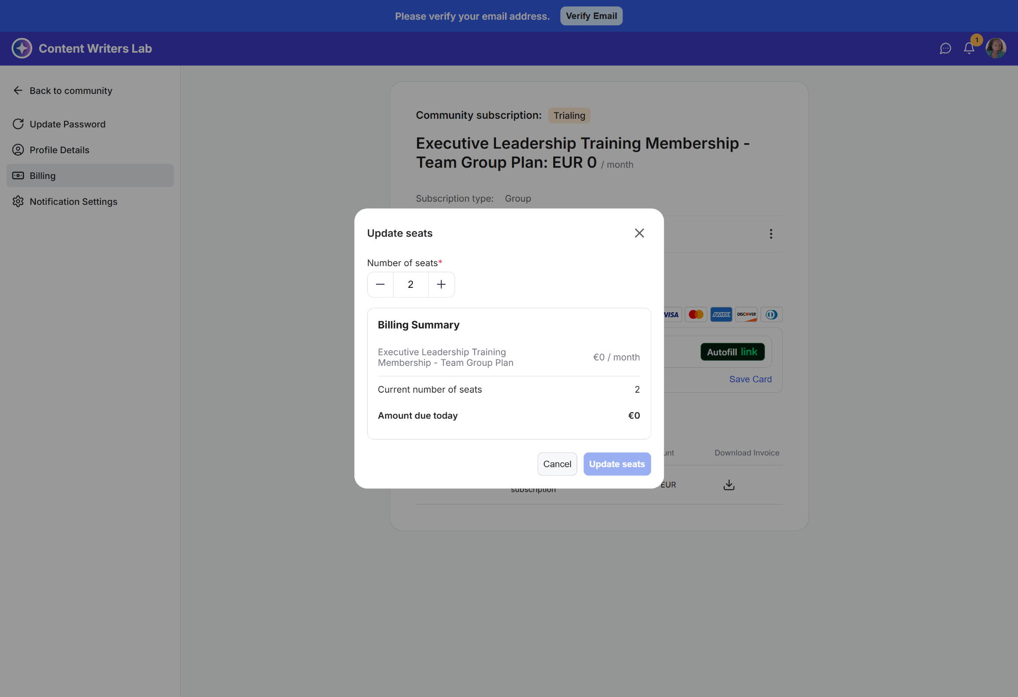 Note: You cannot reduce the seat count below the minimum set by the community for your group subscription.