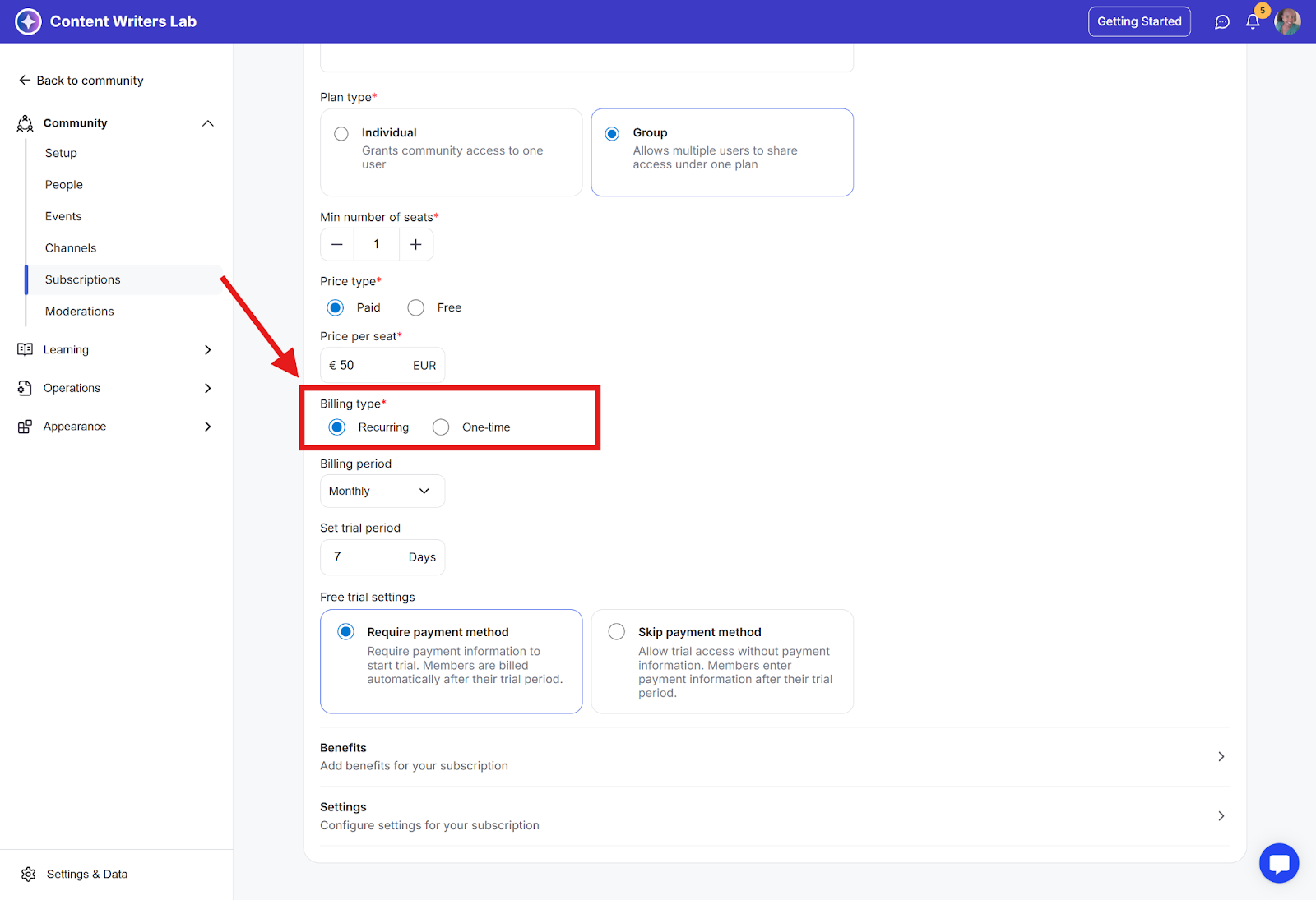 One-time: Charges only to access the product, either for a set period or unlimited access. This works best for digital downloads, workshops, or standalone training programs.