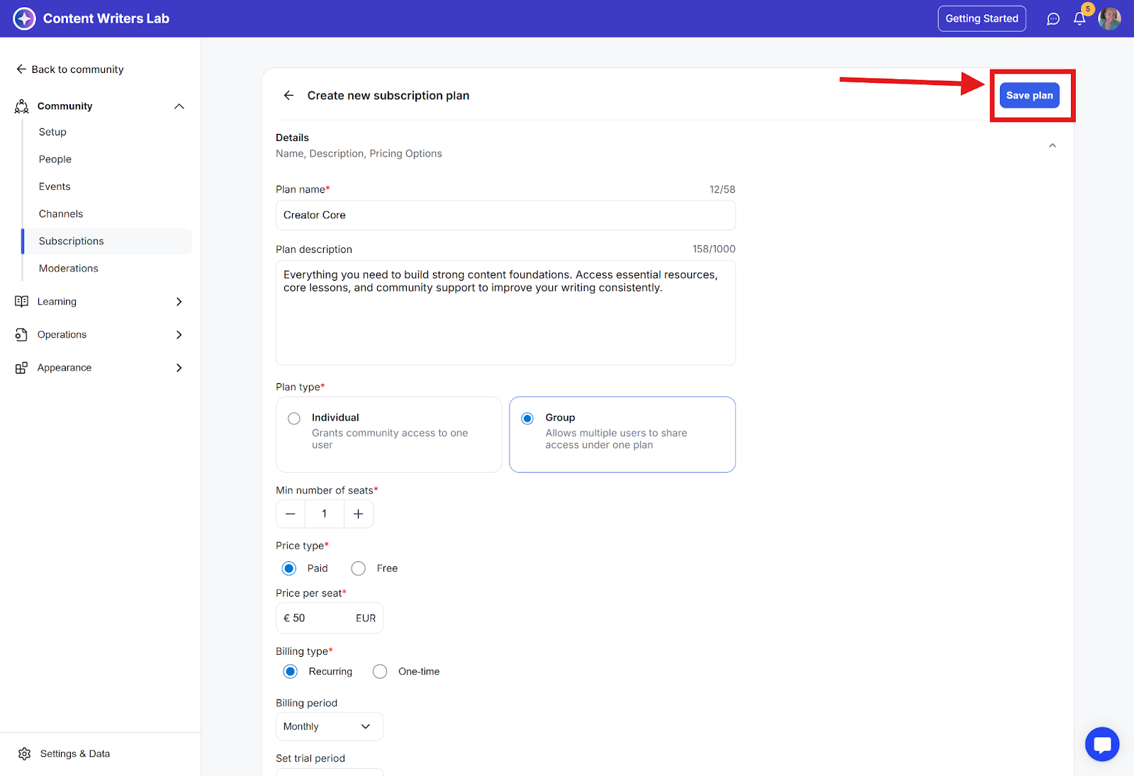 Step 13:Click on the Save Plan button on the top-right of the dashboard, and it will appear in your subscriptions dashboard, ready to sell.