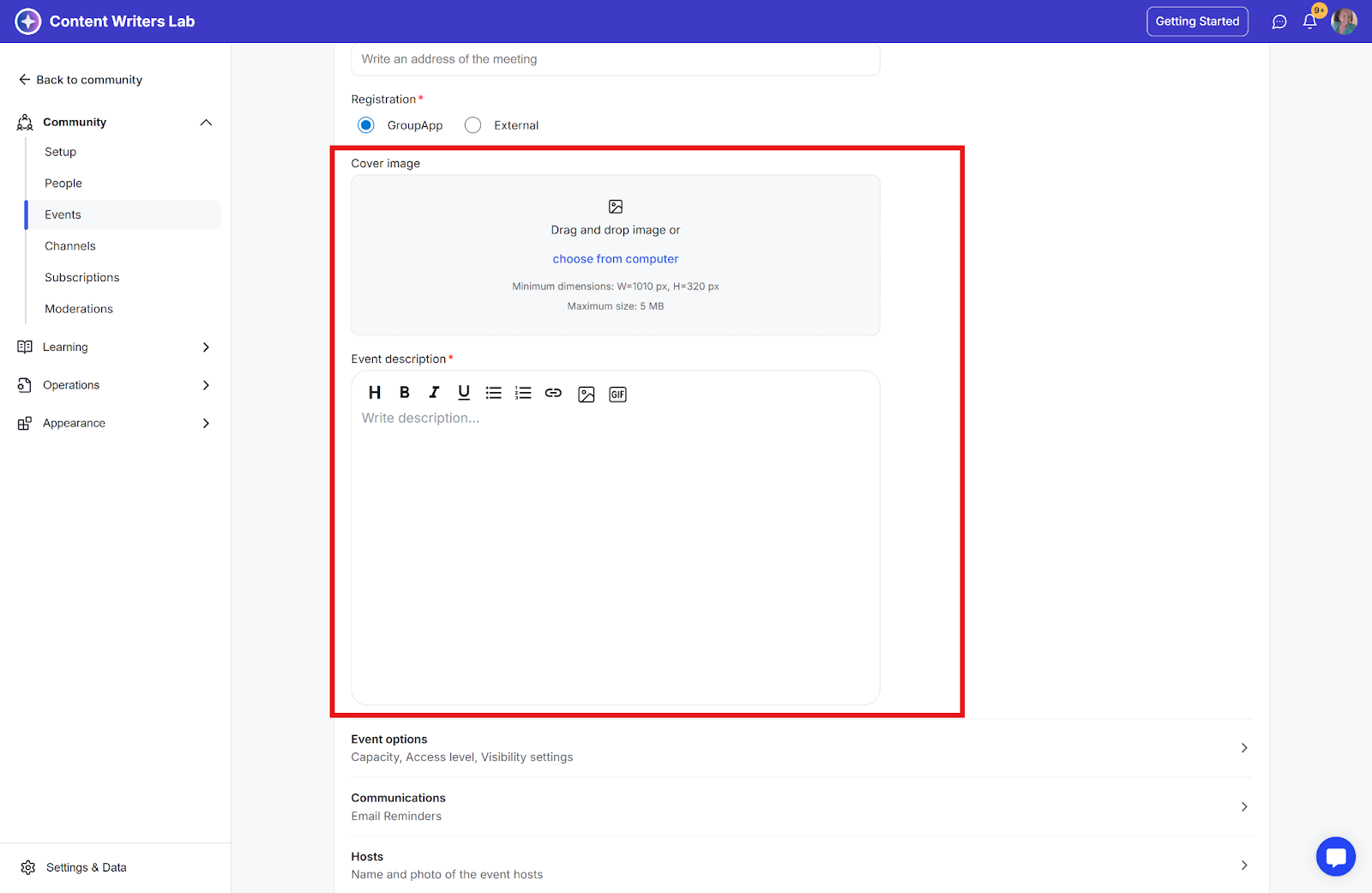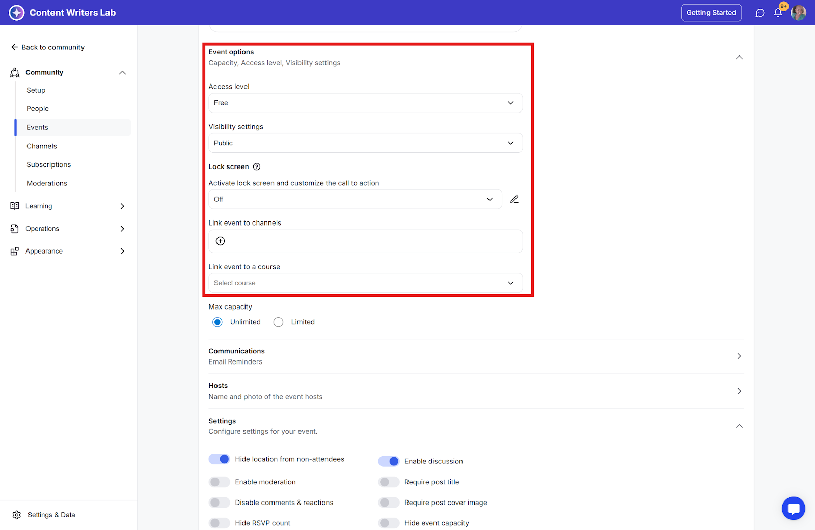 Step 11: Next, configure Event Options. Set access level, visibility, lockscreen, link to channel, and link to course.