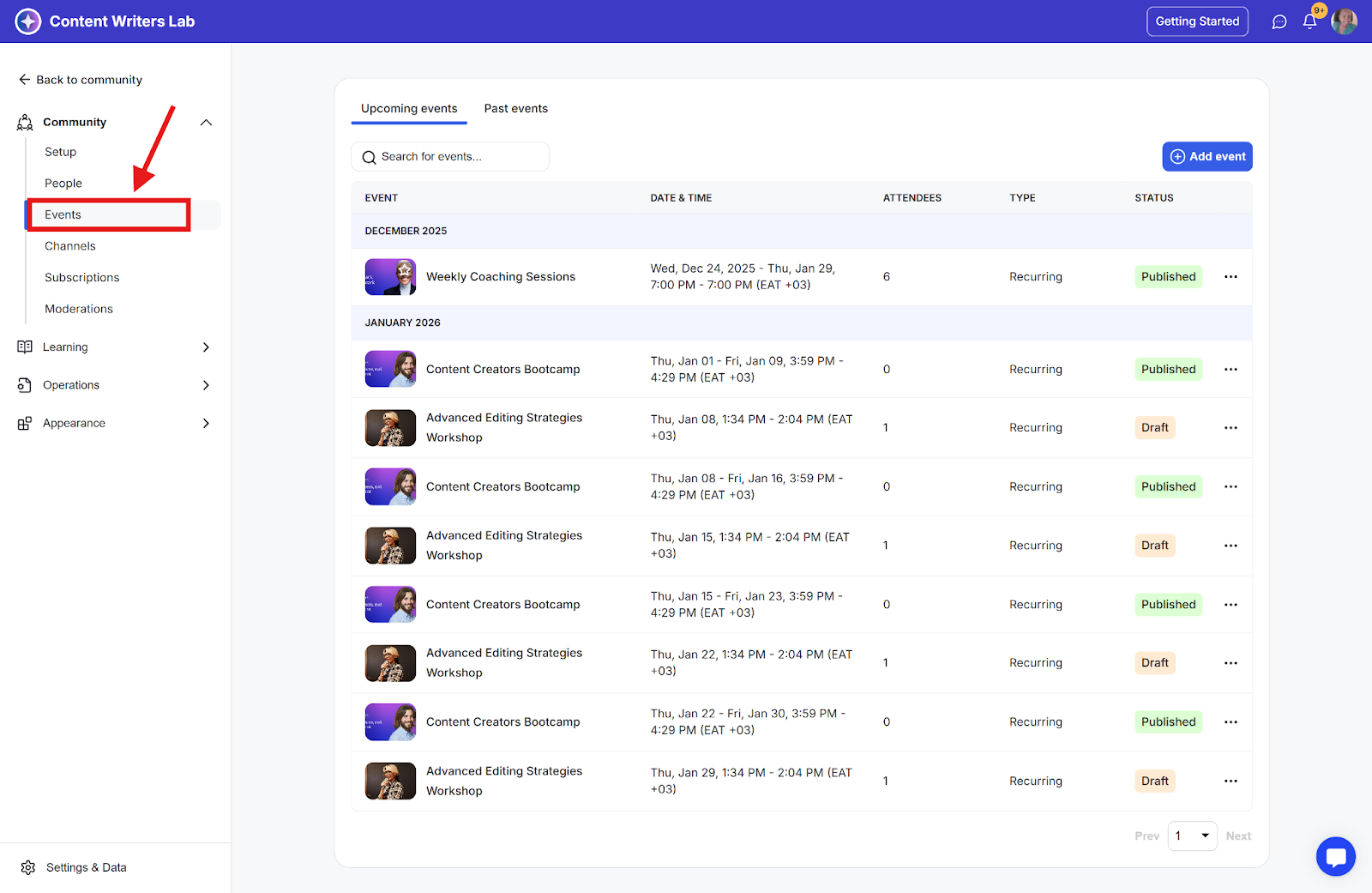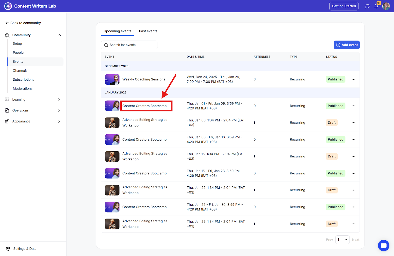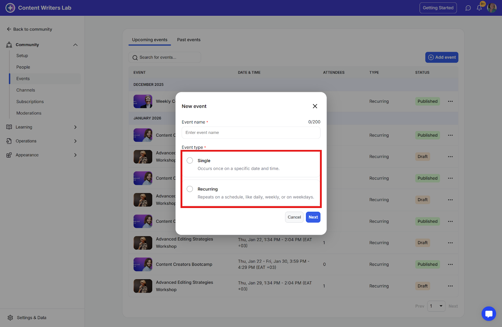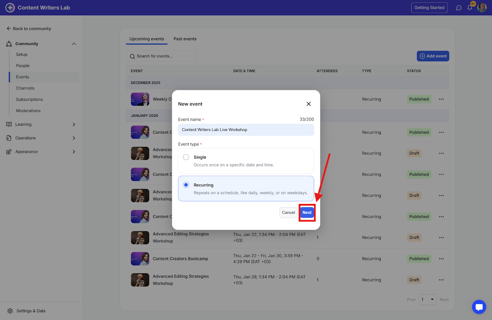 Recurring Events let you schedule one event that repeats on a set cadence (daily, weekdays, or a specific weekday) so members can register once and follow a clear rhythm. They’re ideal for ongoing sessions like office hours, weekly workshops, or multi-week programs.