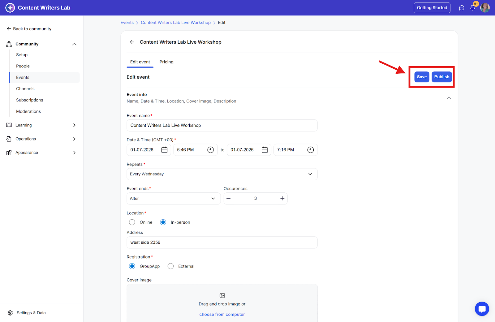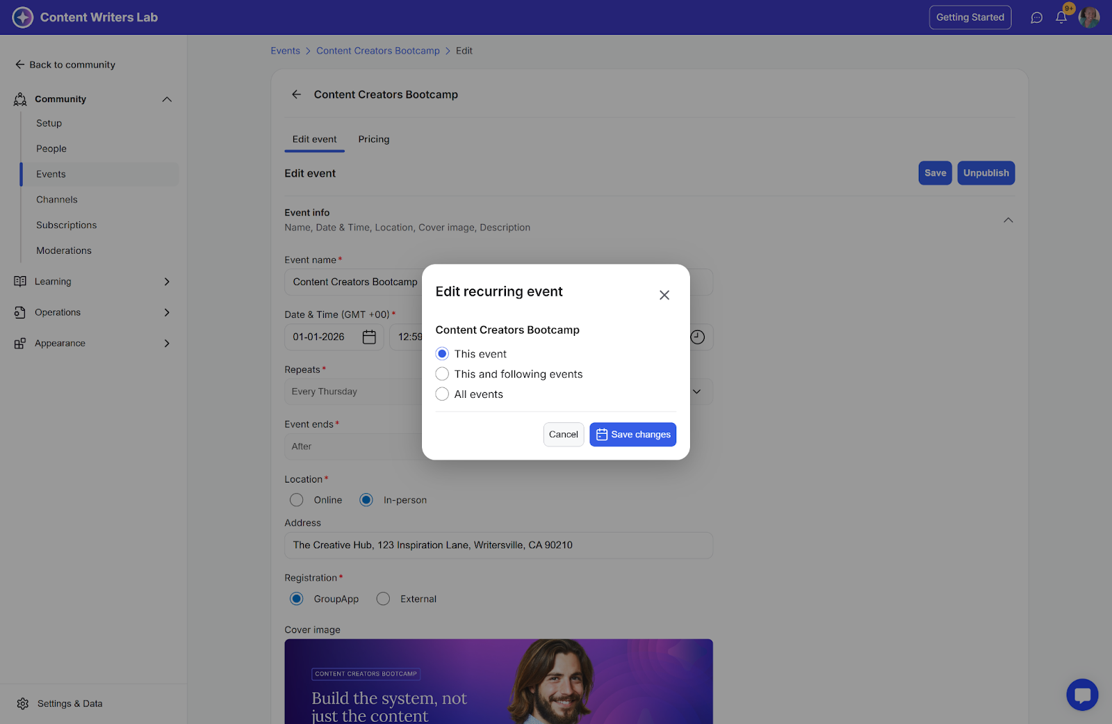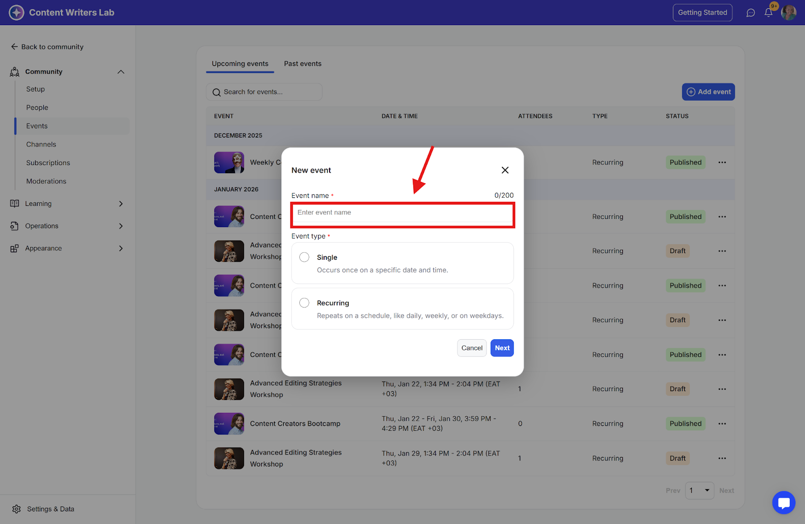 Recurring Events let you schedule one event that repeats on a set cadence (daily, weekdays, or a specific weekday) so members can register once and follow a clear rhythm. They’re ideal for ongoing sessions like office hours, weekly workshops, or multi-week programs.