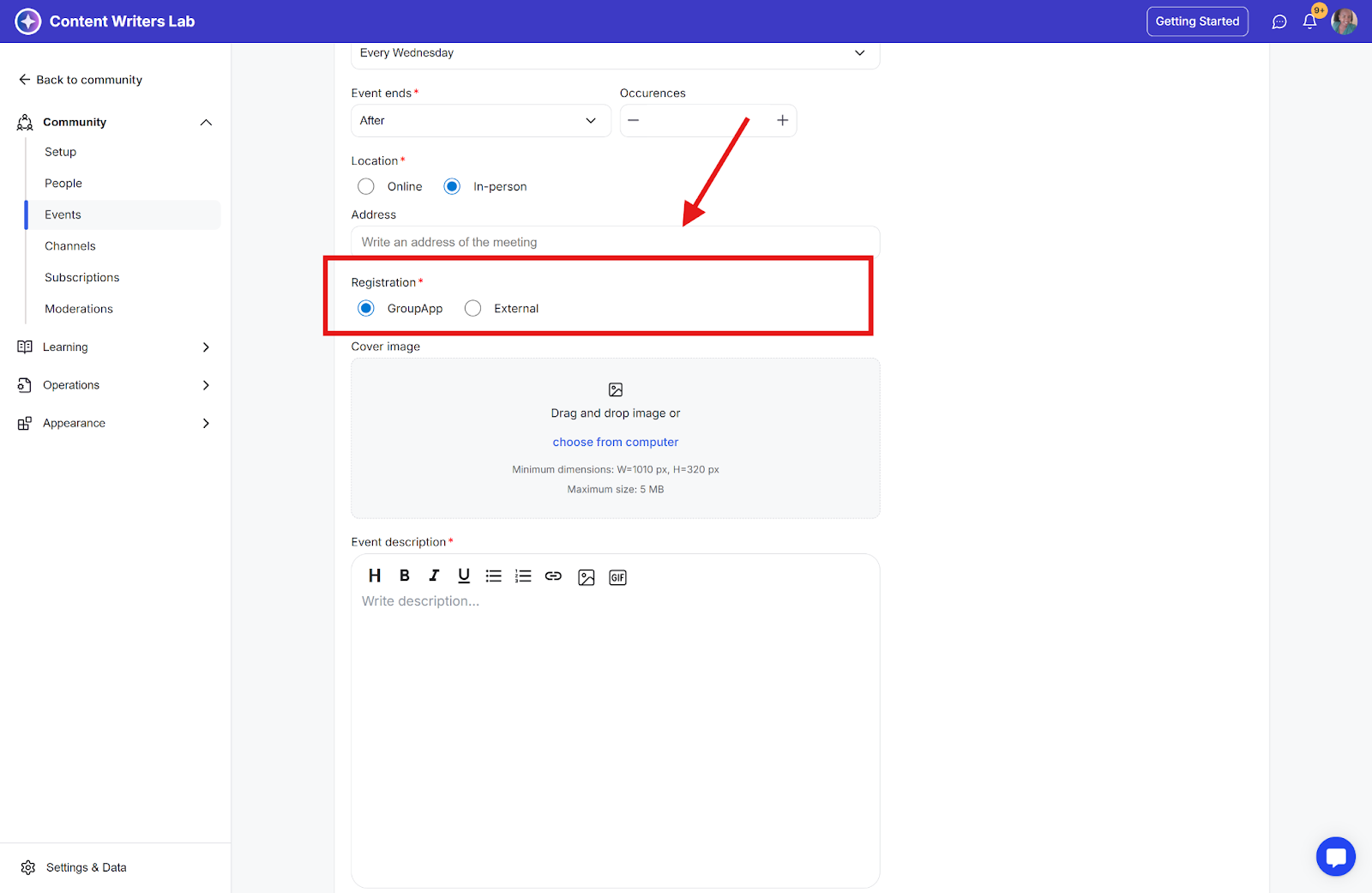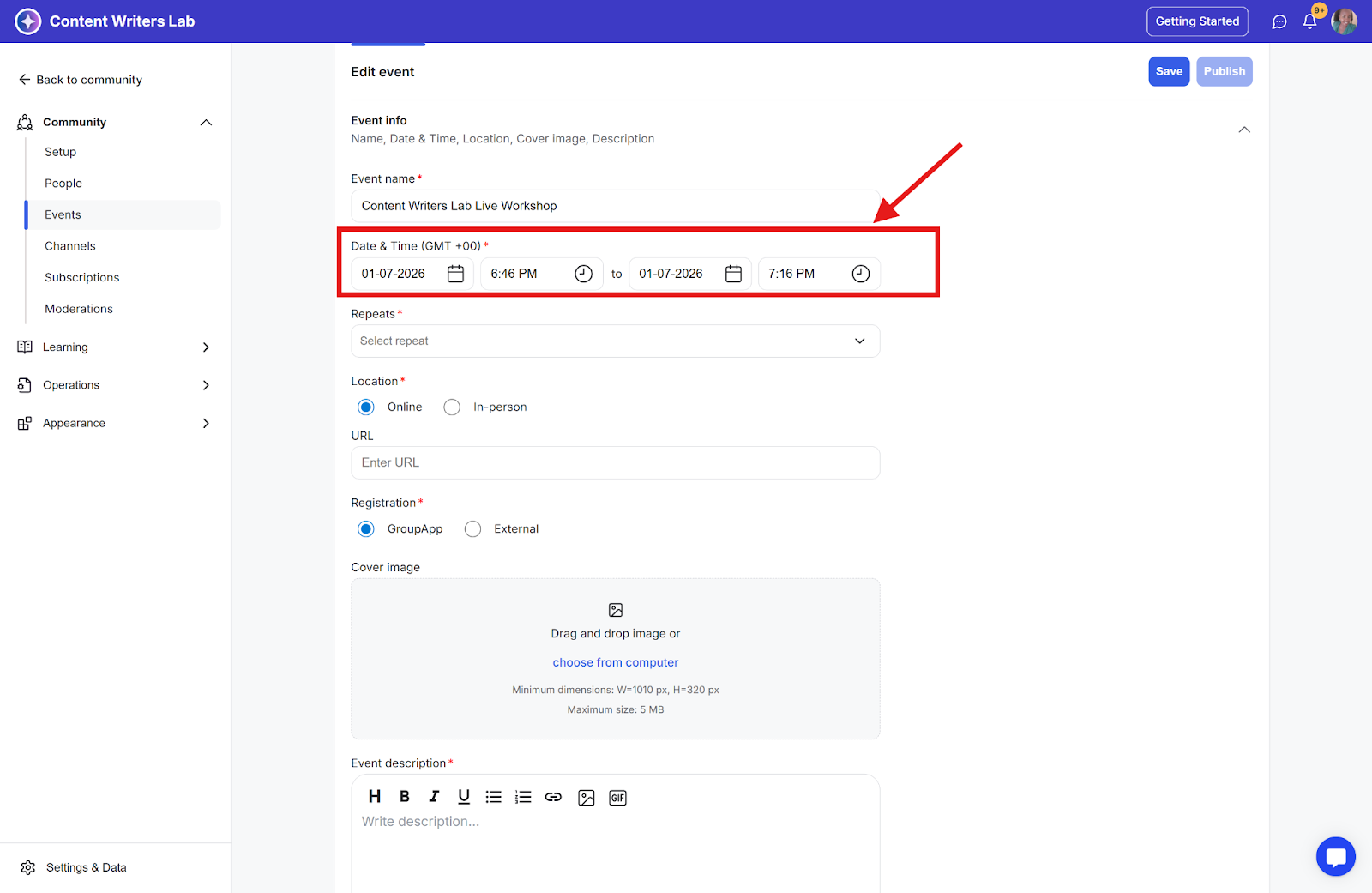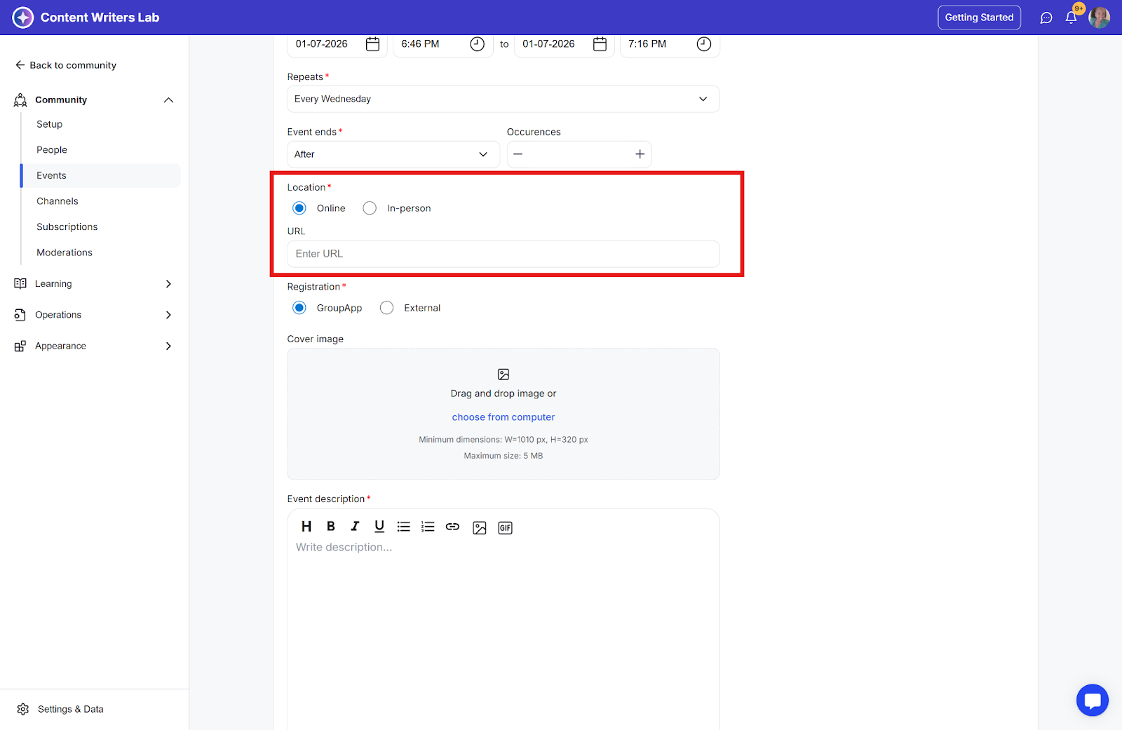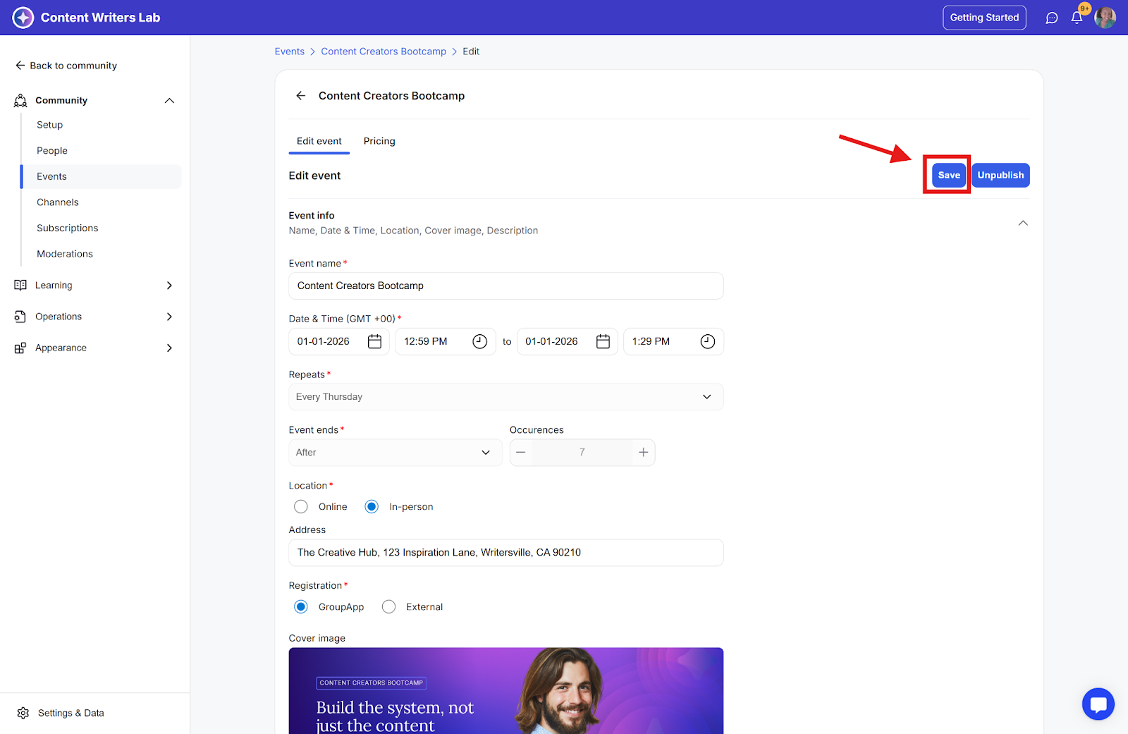 Recurring Events let you schedule one event that repeats on a set cadence (daily, weekdays, or a specific weekday) so members can register once and follow a clear rhythm. They’re ideal for ongoing sessions like office hours, weekly workshops, or multi-week programs.