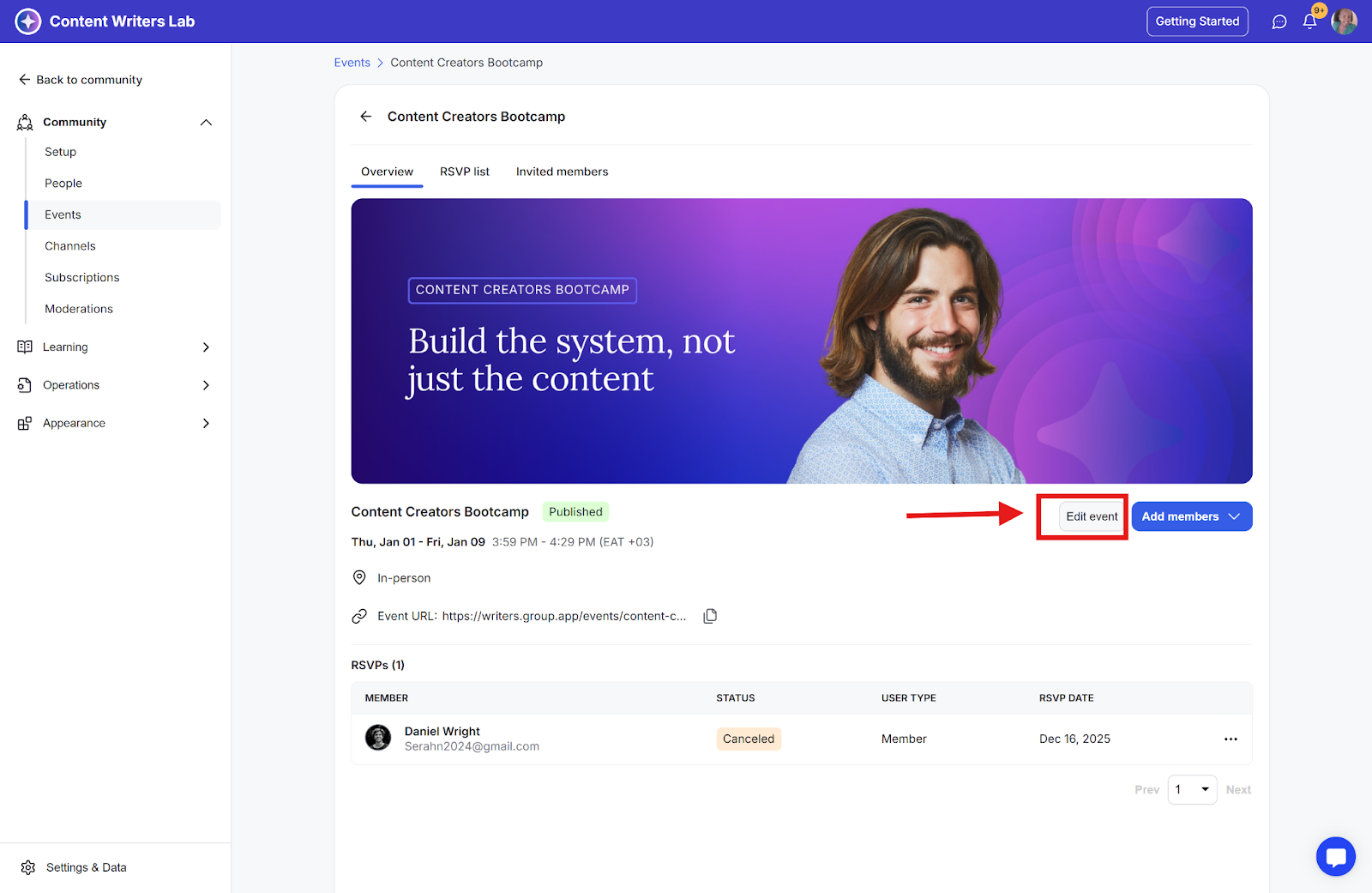 Step 3: Click Edit Event (top-right). You can edit all options except those that appear turned off.