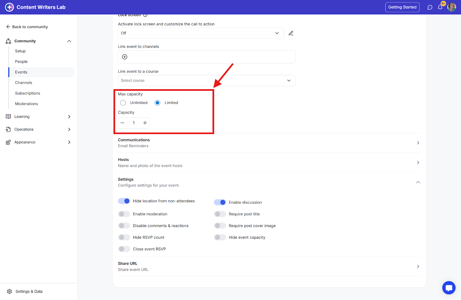 Step 12: Choose the maximum capacity from unlimited or limited. If limited, set the maximum attendees.