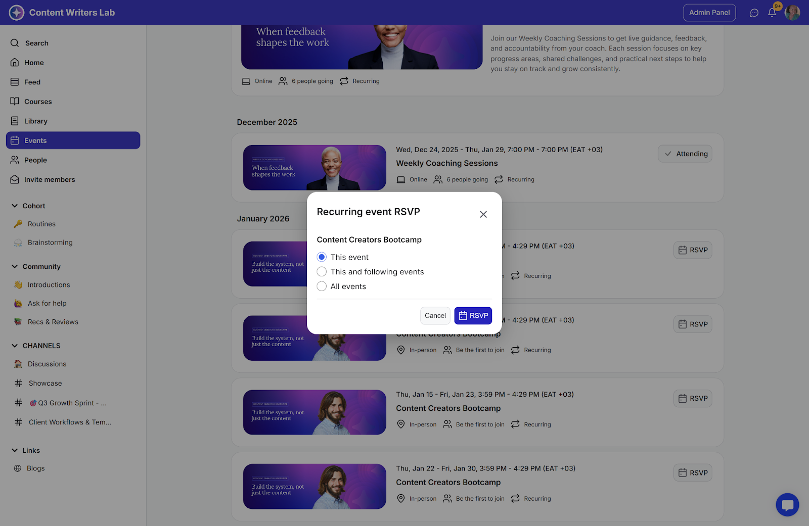 Recurring Events appear in the community event calendar. Members with access can RSVP with: