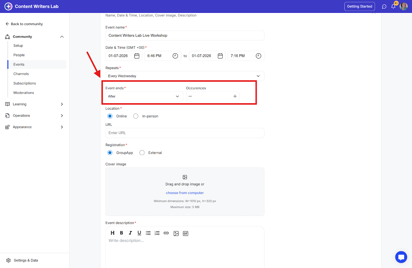 Weekday Cohort Sessions: Run a 10-day challenge Monday to Friday with a fixed “ends after 10 occurrences” setup.